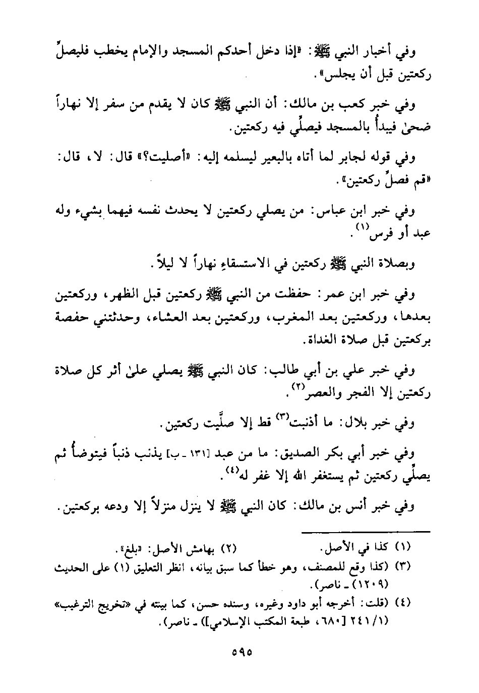 وَفِي خَبَرِ عَلِيِّ بْنِ أَبِي طَالِبٍ: كَانَ النَّبِيُّ صَلَّى اللَّهُ عَلَيْهِ وَسَلَّمَ يُصَلِّي عَلَى أَثَرِ كُلِّ صَلَاةٍ رَكْعَتَيْنِ إِلَّا الْفَجْرَ، وَالْعَصْرَ (¬2).