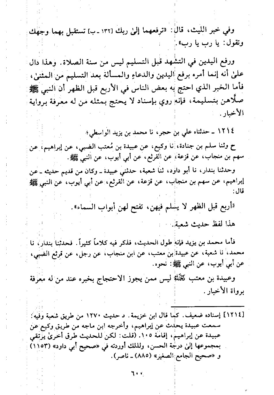 وَرَفْعُ الْيَدَيْنِ فِي التَّشَهُّدِ قَبْلَ التَّسْلِيمِ لَيْسَ مِنْ سُنَّةِ الصَّلَاةِ. وَهَذَا دَالٌّ عَلَى أَنَّهُ إِنَّمَا أَمَرَهُ بِرَفْعِ الْيَدَيْنِ وَالدُّعَاءِ وَالْمَسْأَلَةُ بَعْدَ التَّسْلِيمِ مِنَ الْمَثْنَى، فَأَمَّا الْخَبَرُ الَّذِي احْتَجَّ بِهِ بَعْضُ النَّاسِ فِي الْأَرْبَعِ قَبْلَ الظُّهْرِ أَنَّ النَّبِيَّ صَلَّى اللَّهُ عَلَيْهِ وَسَلَّمَ صَلَّاهُنَّ بِتَسْلِيمَةٍ، فَإِنَّهُ رُوِيَ بِإِسْنَادٍ لَا يَحْتَجُّ بِمِثْلِهِ مَنْ لَهِ مَعْرِفَةٌ بِرِوَايَةِ الْأَخْبَارِ.