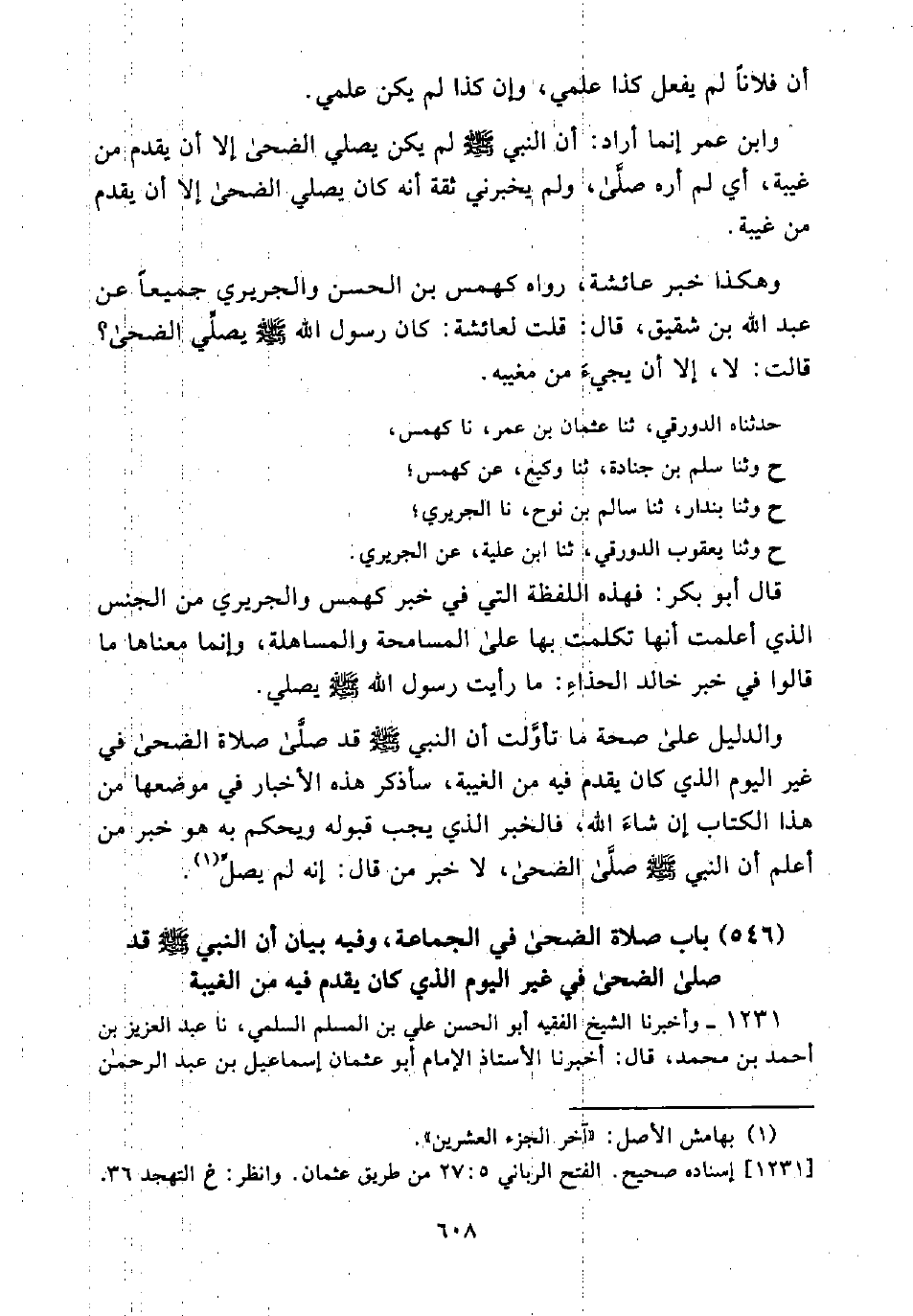 وَالدَّلِيلُ عَلَى صِحَّةِ مَا تَأَوَّلْتُ أَنَّ النَّبِيَّ صَلَّى اللَّهُ عَلَيْهِ وَسَلَّمَ قَدْ صَلَّى صَلَاةَ الضُّحَى فِي غَيْرِ الْيَوْمِ الَّذِي كَانَ يَقْدَمُ فِيهِ مِنَ الْغَيْبَةِ، سَأَذْكُرُ هَذِهِ الْأَخْبَارَ فِي مَوْضِعَهَا مِنْ هَذَا الْكِتَابِ إِنْ شَاءَ اللَّهُ، فَالْخَبَرُ الَّذِي يَجِبُ قَبُولُهُ وَيُحْكَمُ بِهِ هُوَ خَبَرُ مَنْ أَعْلَمَ أَنَّ النَّبِيَّ صَلَّى اللَّهُ عَلَيْهِ وَسَلَّمَ صَلَّى الضُّحَى، لَا خَبَرُ مَنْ قَالَ: إِنَّهُ لَمْ يُصَلِّ (¬1).