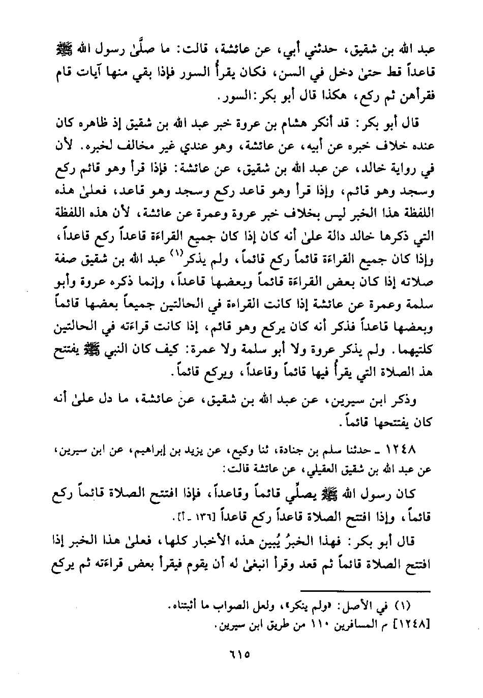 قَالَ أَبُو بَكْرٍ: قَدْ أَنْكَرَ هِشَامُ بْنُ عُرْوَةَ خَبَرَ عَبْدِ اللَّهِ بْنِ شَقِيقٍ إِذْ ظَاهِرُهُ كَانَ عِنْدَهُ خِلَافَ خَبَرِهِ عَنْ أَبِيهِ، عَنْ عَائِشَةَ، وَهُوَ عِنْدِي غَيْرُ مُخَالِفٍ لِخَبَرِهِ. لِأَنَّ فِي رِوَايَةِ خَالِدٍ، عَنْ عَبْدِ اللَّهِ بْنِ شَقِيقٍ، عَنْ عَائِشَةَ: فَإِذَا قَرَأَ وَهُوَ قَائِمٌ رَكَعَ وَسَجَدَ وَهُوَ قَائِمٌ، وَإِذَا قَرَأَ وَهُوَ قَاعِدٌ رَكَعَ وَسَجَدَ وَهُوَ قَاعِدٌ، فَعَلَى هَذِهِ اللَّفْظَةِ هَذَا الْخَبَرُ لَيْسَ بِخِلَافِ خَبَرِ عُرْوَةَ وَعَمْرَةَ عَنْ عَائِشَةَ، لِأَنَّ هَذِهِ اللَّفْظَةَ الَّتِي ذَكَرَهَا خَالِدٌ دَالَّةٌ عَلَى أَنَّهُ كَانَ إِذَا كَانَ جَمِيعُ الْقِرَاءَةِ قَاعِدًا رَكَعَ قَاعِدًا، وَإِذَا كَانَ جَمِيعُ الْقِرَاءَةِ قَائِمًا رَكَعَ قَائِمًا، وَلَمْ يَذْكُرْ (¬1) عَبْدُ اللَّهِ بْنُ شَقِيقٍ صِفَةَ صَلَاتِهِ إِذَا كَانَ بَعْضُ الْقِرَاءَةِ قَائِمًا وَبَعْضُهَا قَاعِدًا، وَإِنَّمَا ذَكَرَهُ عُرْوَةُ وَأَبُو سَلَمَةَ وَعَمْرَةُ عَنْ عَائِشَةَ إِذَا كَانَتِ الْقِرَاءَةُ فِي الْحَالَتَيْنِ جَمِيعًا بَعْضُهَا قَائِمًا وَبَعْضُهَا قَاعِدًا فَذَكَرَ أَنَّهُ كَانَ يَرْكَعُ وَهُوَ قَائِمٌ، إِذَا كَانَتْ قِرَاءَتُهُ فِي الْحَالَتَيْنِ كِلْتَيْهِمَا. وَلَمْ يَذْكُرْ عُرْوَةُ وَلَا أَبُو سَلَمَةَ وَلَا عَمْرَةُ: كَيْفَ كَانَ النَّبِيُّ صَلَّى اللَّهُ عَلَيْهِ وَسَلَّمَ يَفْتَتِحُ هَذِهِ الصَّلَاةَ الَّتِي يَقْرَأُ فِيهَا قَائِمًا وَقَاعِدًا، وَيَرْكَعُ قَائِمًا.