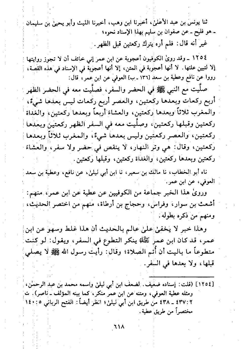 [1254] (قلت: إسناده ضعيف. لضعف ابن أبي ليلى واسمه محمد بن عبد الرحمن، ومثله عطية العوفي، ومتنه عن ابن عمر منكر، كما بينه المؤلف - ناصر). ت 2: 437 - 438 من طريق ابن أبي ليلى؛ انظر أيضًا: الفتح الرباني 5: 140 مختصرًا من طريق عطية.