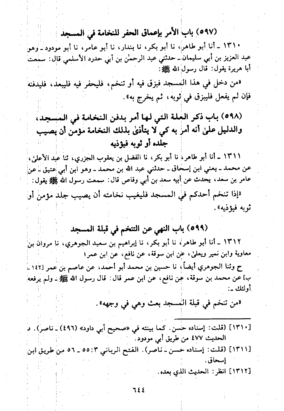 "إِذَا تَنَخَّمَ أَحَدُكُمْ فِي الْمَسْجِدِ فَلْيُغَيِّبْ نُخَامَتَهُ أَنْ يُصِيبَ جِلْدَ مُؤْمِنٍ أَوْ ثَوْبَهُ فَيُؤْذِيَهُ".