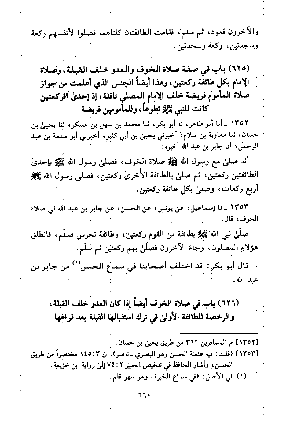 (625) بَابٌ فِي صِفَةِ صَلَاةِ الْخَوْفِ وَالْعَدُوُّ خَلْفَ الْقِبْلَةِ، وَصَلَاةِ الْإِمَامِ بِكُلِّ طَائِفَةٍ رَكْعَتَيْنِ، وَهَذَا أَيْضًا الْجِنْسُ الَّذِي أَعْلَمْتُ مِنْ جَوَازِ صَلَاةِ الْمَأْمُومِ فَرِيضَةً خَلْفَ الْإِمَامِ الْمُصَلِّي نَافِلَةً، إِذْ إِحْدَى الرَّكْعَتَيْنِ كَانَتْ لِلنَّبِيِّ صَلَّى اللَّهُ عَلَيْهِ وَسَلَّمَ تَطَوُّعًا، وَلِلْمَأْمُومِينَ فَرِيضَةً