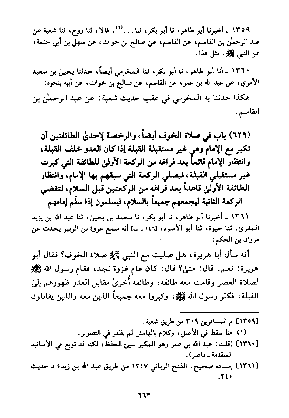 (629) بَابٌ فِي صَلَاةِ الْخَوْفِ أَيْضًا، وَالرُّخْصَةِ لِإِحْدَى الطَّائِفَتَيْنِ أَنْ تُكَبِّرَ مَعَ الْإِمَامِ وَهِيَ غَيْرُ مُسْتَقْبِلَةٍ الْقِبْلَةَ إِذَا كَانَ الْعَدُوُّ خَلْفَ الْقِبْلَةِ، وَانْتِظَارِ الْإِمَامِ قَائِمًا بَعْدَ فَرَاغِهِ مِنَ الرَّكْعَةِ الْأُولَى لِلطَّائِفَةِ الَّتِي كَبَّرَتْ غَيْرَ مُسْتَقْبِلِي الْقِبْلَةِ فَيُصَلِّي الرَّكْعَةَ الَّتِي سَبَقَهُمْ بِهَا الْإِمَامُ، وَانْتِظَارِ الطَّائِفَةِ الْأُولَى قَاعِدًا بَعْدَ فَرَاغِهِ مِنَ الرَّكْعَتَيْنِ قَبْلَ السَّلَامِ، لِتُقْضَى الرَّكْعَةُ الثَّانِيَةُ لِيَجْمَعَهُمْ جَمِيعًا بِالسَّلَامِ، فَيُسَلِّمُونَ إِذَا سَلَّمَ إِمَامُهُمْ