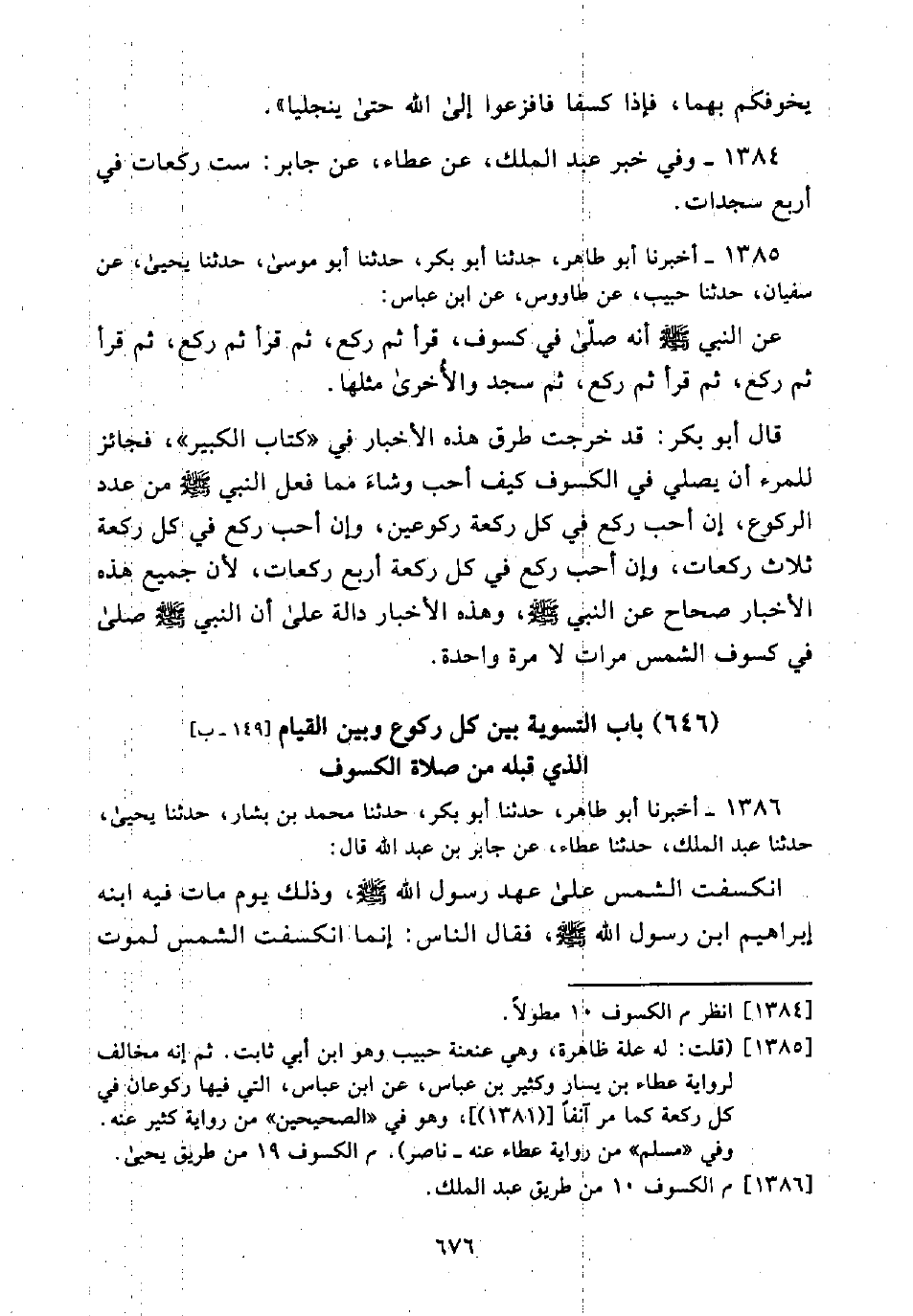 [1385] (قلت: له علة ظاهرة، وهي عنعنة حبيب وهو ابن أبي ثابت. ثم إنه مخالف لرواية عطاء بن يسار وكثير بن عباس، عن ابن عباس، التي فيها ركوعان في كل ركعة كما مر آنفًا [(1381)]، وهو في "الصحيحين" من رواية كثير عنه.
