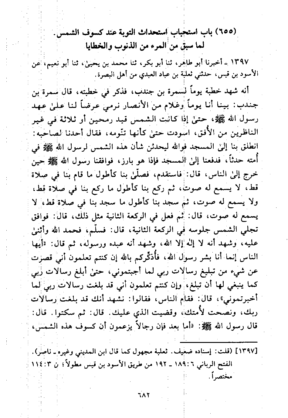 أَنَّهُ شَهِدَ خُطْبَةً يَوْمًا لِسَمُرَةَ بْنِ جُنْدُبٍ، فَذَكَرَ فِي خُطْبَتِهِ، قَالَ سَمُرَةُ بْنُ جُنْدُبٍ: بَيْنَا أَنَا يَوْمًا وَغُلَامٌ مِنَ الْأَنْصَارِ نَرْمِي غَرَضًا لَنَا عَلَى عَهْدِ رَسُولِ اللَّهِ صَلَّى اللَّهُ عَلَيْهِ وَسَلَّمَ، حَتَّى إِذَا كَانَتِ الشَّمْسُ قَيْدَ رُمْحَيْنِ، أَوْ ثَلَاثَةٍ فِي غَيْرِ النَّاظِرِينَ مِنَ الْأُفُقِ، اسْوَدَّتْ حَتَّى كَأَنَّهَا تَنُّومَةٌ، فَقَالَ أَحَدُنَا لِصَاحِبِهِ: انْطَلِقْ بِنَا إِلَى الْمَسْجِدِ فَوَاللَّهِ لَيُحْدِثَنَّ شَأْنُ هَذِهِ الشَّمْسِ لِرَسُولِ اللَّهِ صَلَّى اللَّهُ عَلَيْهِ وَسَلَّمَ فِي أُمَّتِهِ حَدَثًا، فَدَفَعْنَا إِلَى الْمَسْجِدِ فَإِذَا هُوَ بَارِزٌ، فَوَافَقْنَا رَسُولَ اللَّهِ صَلَّى اللَّهُ عَلَيْهِ وَسَلَّمَ حِينَ خَرَجَ إِلَى النَّاسِ، قَالَ: فَاسْتَقْدَمَ، فَصَلَّى بِنَا كَأَطْوَلِ مَا قَامَ بِنَا فِي صَلَاةٍ قَطُّ، لَا يُسْمَعُ لَهُ صَوْتٌ، ثُمَّ رَكَعَ بِنَا كَأَطْوَلِ مَا رَكَعَ بِنَا فِي صَلَاةٍ قَطُّ، وَلَا يُسْمَعُ لَهُ صَوْتٌ، ثُمَّ سَجَدَ بِنَا كَأَطْوَلِ مَا سَجَدَ بِنَا فِي صَلَاةٍ قَطُّ، لَا يُسْمَعُ لَهُ صَوْتٌ، قَالَ: ثُمَّ فَعَلَ فِي الرَّكْعَةِ الثَّانِيَةِ مِثْلَ ذَلِكَ، قَالَ: فَوَافَقَ تَجَلِّي الشَّمْسِ جُلُوسَهُ فِي الرَّكْعَةِ الثَّانِيَةِ، قَالَ: فَسَلَّمَ، فَحَمِدَ اللَّهَ وَأَثْنَى عَلَيْهِ، وَشَهِدَ أَنَّهُ لَا إِلَهَ إِلَّا اللَّهُ، وَشَهِدَ أَنَّهُ عَبْدُهُ وَرَسُولُهُ، ثُمَّ قَالَ: "أَيُّهَا النَّاسُ إِنَّمَا أَنَا بَشَرٌ رَسُولُ اللَّهِ، فَأُذَكِّرُكُمْ بِاللَّهِ إِنْ كُنْتُمْ تَعْلَمُونَ أَنِّي قَصَّرْتُ عَنْ شَيْءٍ مِنْ تَبْلِيغِ رِسَالَاتِ رَبِّي لَمَا أَجَبْتُمُونِي، حَتَّى أُبَلِّغَ رِسَالَاتِ رَبِّي كَمَا يَنْبَغِي لَهَا أَنْ تُبَلَّغَ، وَإِنْ كُنْتُمْ تَعْلَمُونَ أَنِّي قَدْ بَلَّغْتُ رِسَالَاتِ رَبِّي لَمَا أَخْبَرْتُمُونِي"، قَالَ: فَقَامَ النَّاسُ، فَقَالُوا: نَشْهَدُ أَنَّكَ قَدْ بَلَّغْتَ رِسَالَاتِ رَبِّكَ، وَنَصَحْتَ لِأُمَّتِكَ، وَقَضَيْتَ الَّذِي عَلَيْكَ. قَالَ: ثُمَّ سَكَتُوا. قَالَ: قَالَ رَسُولُ اللَّهِ صَلَّى اللَّهُ عَلَيْهِ وَسَلَّمَ: "أَمَّا بَعْدُ فَإِنَّ رِجَالًا يَزْعُمُونَ أَنَّ كُسُوفَ هَذِهِ الشَّمْسِ،