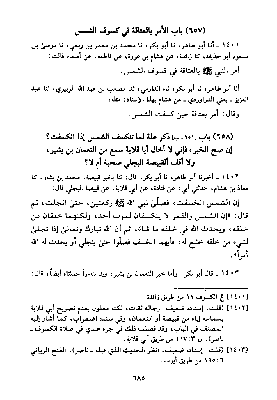 [1402] (قلت: إسناده ضعيف. رجاله ثقات، لكنه معلول بعدم تصريح أبي قلابة بسماعه إياه من قبيصة أو النعمان، وفي سنده اضطراب، كما أشار إليه المصنف في الباب، وقد فصلت ذلك في جزء عندي في صلاة الكسوف - ناصر). ن 117:3 من طريق أبي قلابة.