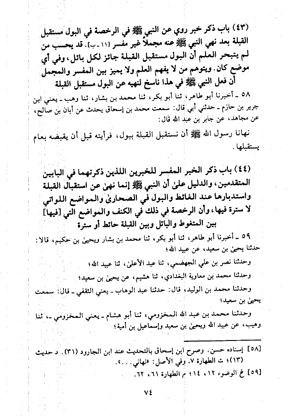 (43) بَابُ ذِكْرِ خَبَرٍ رُوِيَ عَنِ النَّبِيِّ - صَلَّى اللَّهُ عَلَيْهِ وَسَلَّمَ - فِي الرُّخْصَةِ فِي الْبَوْلِ مُسْتَقْبِلَ الْقِبْلَةَ بَعْدَ نَهْيِ النَّبِيِّ - صَلَّى اللَّهُ عَلَيْهِ وَسَلَّمَ - عَنْهُ مُجْمَلًا غَيْرَ مُفَسَّرٍ [11 - ب]. قَدْ يَحْسَبُ مَنْ لَمْ يَتَبَحَّرْ الْعِلْمَ أَنَّ الْبَوْلَ مُسْتَقْبِلَ الْقِبْلَةِ جَائِزٌ لِكُلِّ بَائِلٍ، وَفِي أَيِّ مَوْضِعٍ كَانَ. وَيَتَوَهَّمُ مَنْ لَا يَفْهَمُ الْعِلْمَ وَلَا يُمَيِّزُ بَيْنَ الْمُفَسَّرِ وَالْمُجْمَلِ أَنَّ فِعْلَ النَّبِيِّ - صَلَّى اللَّهُ عَلَيْهِ وَسَلَّمَ - فِي هَذَا نَاسِخٌ لِنَهْيِهِ عَنِ الْبَوْلِ مُسْتَقْبِلَ الْقِبْلَةِ