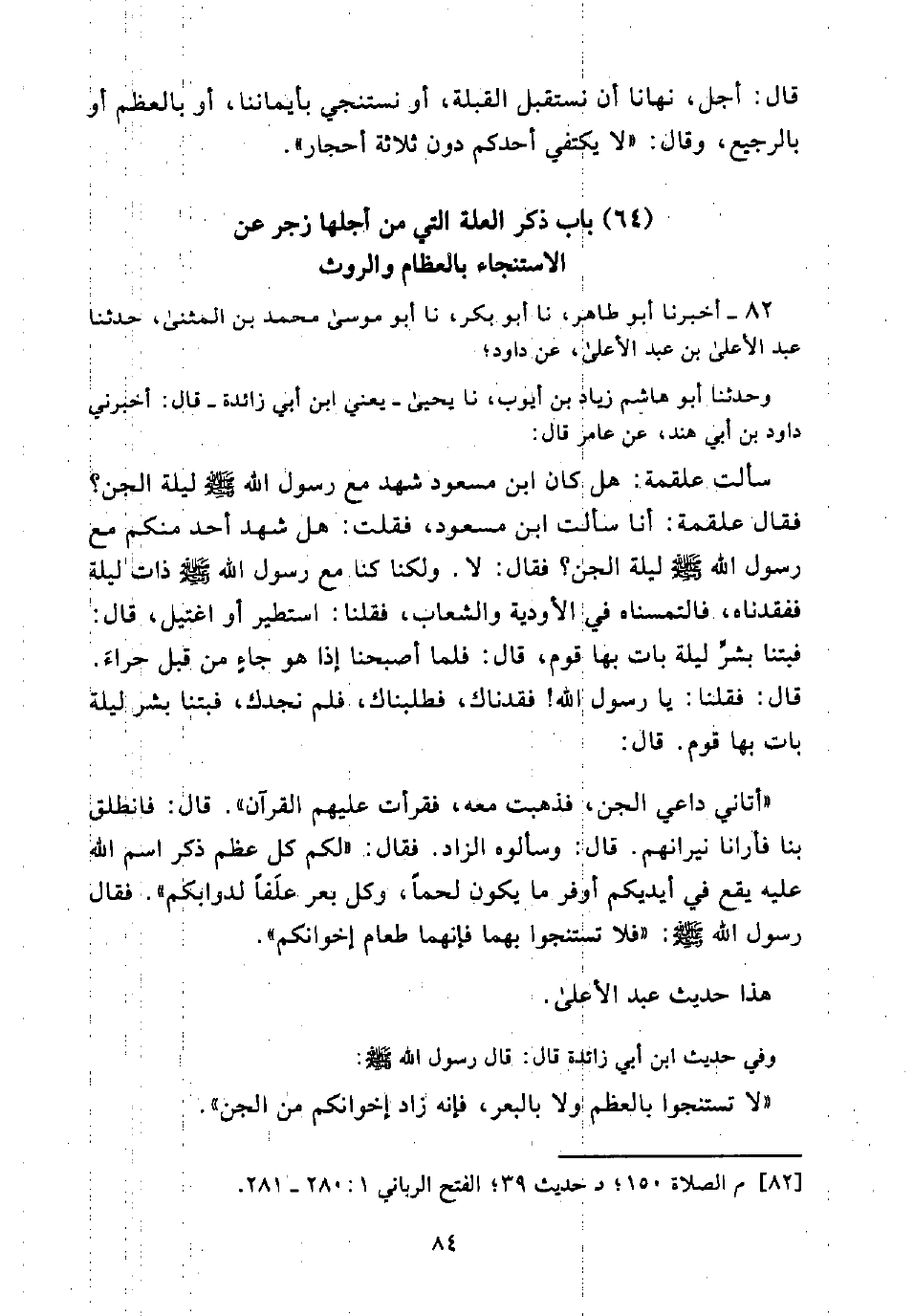 "لَا تَسْتَنْجُوا بِالْعَظْمِ وَلَا بِالْبَعْرِ، فَإِنَّهُ زَادُ إِخْوَانِكُمْ مِنَ الْجِنِّ".