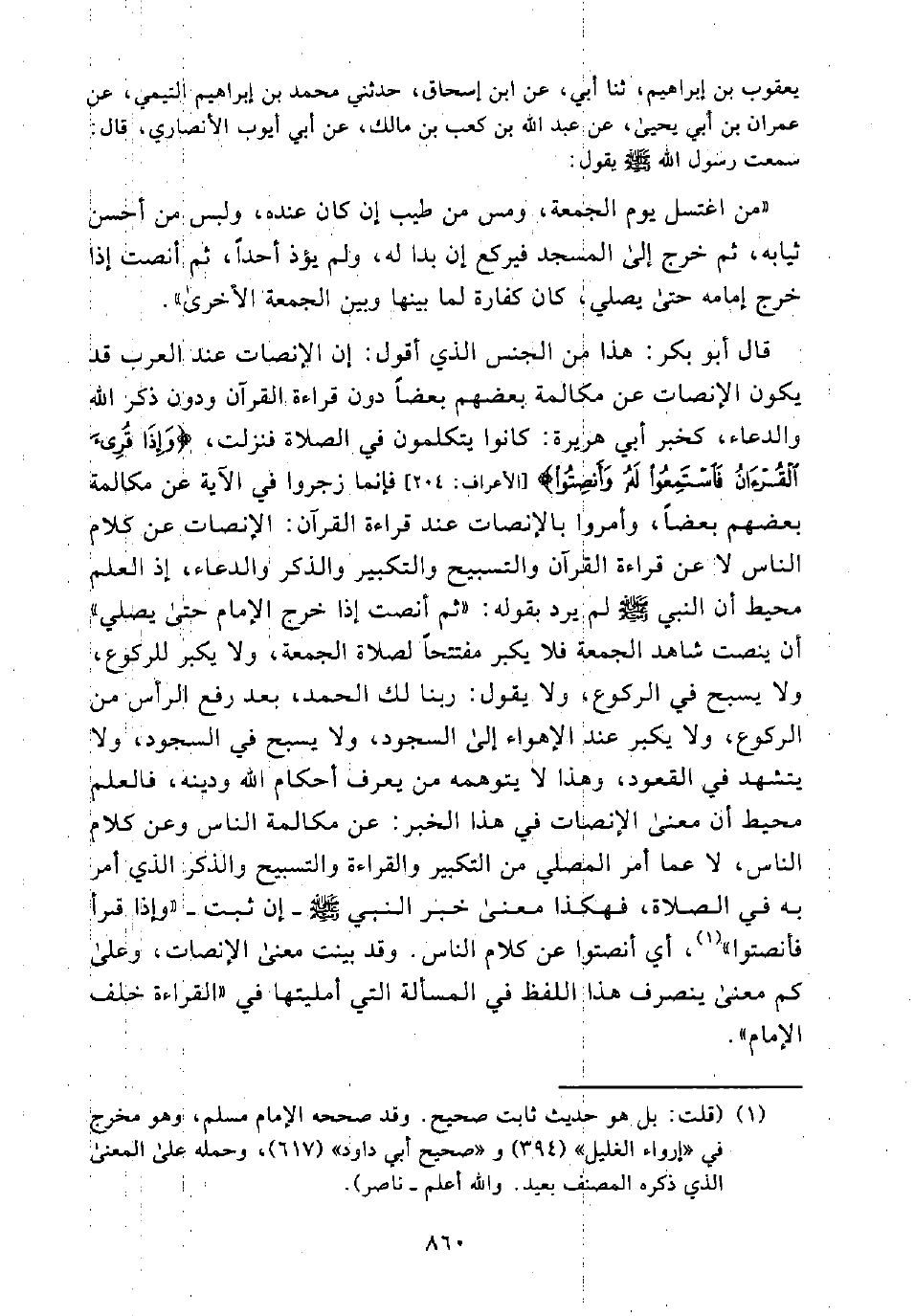 قَالَ أَبُو بَكْرٍ: هَذَا مِنَ الْجِنْسِ الَّذِي أَقُولُ: إِنَّ الْإِنْصَاتَ عِنْدَ الْعَرَبِ قَدْ يَكُونُ الْإِنْصَاتُ عَنْ مُكَالَمَةِ بَعْضِهِمْ بَعْضًا دُونَ قِرَاءَةِ الْقُرْآنِ وَدُونَ ذِكْرِ اللَّهِ وَالدُّعَاءِ، كَخَبَرِ أَبِي هُرَيْرَةَ: كَانُوا يَتَكَلَّمُونَ فِي الصَّلَاةِ فَنَزَلَتْ: (وَإِذَا قُرِئَ الْقُرْآنُ فَاسْتَمِعُوا لَهُ وَأَنْصِتُوا) [الأعراف: 204] فَإِنَّمَا زُجِرُوا فِي الْآيَةِ عَنْ مُكَالَمَةِ بَعْضِهِمْ بَعْضًا، وَأُمِرُوا بِالْإِنْصَاتِ عِنْدَ قِرَاءَةِ الْقُرْآنِ: الْإِنْصَاتِ عَنْ كَلَامِ النَّاسِ لَا عَنْ قِرَاءَةِ الْقُرْآنِ وَالتَّسْبِيحِ وَالتَّكْبِيرِ وَالذِّكْرِ وَالدُّعَاءِ، إِذِ الْعِلْمُ مُحِيطٌ أَنَّ النَّبِيَّ - صَلَّى اللَّهُ عَلَيْهِ وَسَلَّمَ - لَمْ يُرِدْ بِقَوْلِهِ: "ثُمَّ أَنْصَتَ إِذَا خَرَجَ الْإِمَامُ حَتَّى يُصَلِّيَ" أَنْ يُنْصِتَ شَاهِدُ الْجُمُعَةِ فَلَا يُكَبِّرَ مُفْتَتِحًا لِصَلَاةِ الْجُمُعَةِ، وَلَا يُكَبِّرَ لِلرُّكُوعِ، وَلَا يُسَبِّحَ فِي الرُّكُوعِ، وَلَا يَقُولَ: رَبَّنَا لَكَ الْحَمْدُ، بَعْدَ رَفْعِ الرَّأْسِ مِنَ الرُّكُوعِ، وَلَا يُكَبِّرَ عِنْدَ الْإِهْوَاءِ إِلَى السُّجُودِ، وَلَا يُسَبِّحَ فِي السُّجُودِ، وَلَا يَتَشَهَّدَ فِي الْقُعُودِ، وَهَذَا لَا يَتَوَهَّمُهُ مَنْ يَعْرِفُ أَحْكَامَ اللَّهِ وَدِينَهُ، فَالْعِلْمُ مُحِيطٌ أَنَّ مَعْنَى الْإِنْصَاتِ فِي هَذَا الْخَبَرِ: عَنْ مُكَالَمَةِ النَّاسِ وَعَنْ كَلَامِ النَّاسِ، لَا عَمَّا أُمِرَ الْمُصَلِّي مِنَ التَّكْبِيرِ وَالْقِرَاءَةِ وَالتَّسْبِيحِ وَالذِّكْرِ الَّذِي أُمِرَ بِهِ فِي الصَّلَاةِ، فَهَكَذَا مَعْنَى خَبَرِ النَّبِيِّ - صَلَّى اللَّهُ عَلَيْهِ وَسَلَّمَ -إِنْ ثَبَتَ-: "وَإِذَا قَرَأَ فَأَنْصِتُوا" (¬1)، أَيْ: أَنْصِتُوا عَنْ كَلَامِ النَّاسِ. وَقَدْ بَيَّنْتُ مَعْنَى الْإِنْصَاتِ، وَعَلَى كَمْ مَعْنًى يَنْصَرِفُ هَذَا اللَّفْظُ فِي الْمَسْأَلَةِ الَّتِي أَمْلَيْتُهَا فِي "الْقِرَاءَةِ خَلْفَ الْإِمَامِ".