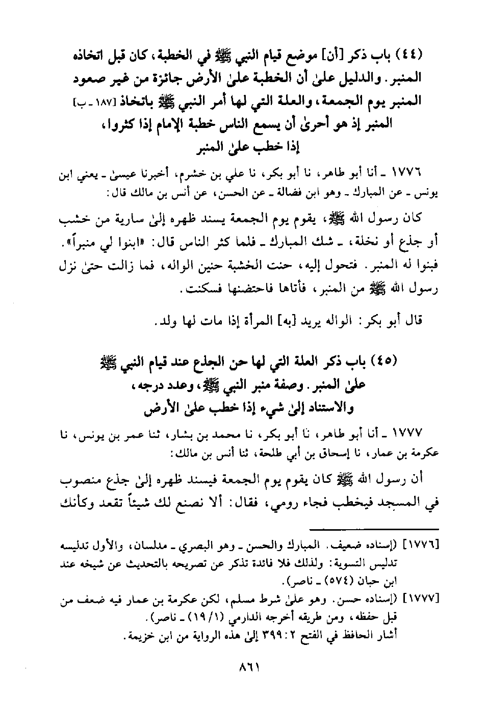 كَانَ رَسُولُ اللَّهِ - صَلَّى اللَّهُ عَلَيْهِ وَسَلَّمَ -، يَقُومُ يَوْمَ الْجُمُعَةِ يُسْنِدُ ظَهْرَهُ إِلَى سَارِيَةٍ مِنْ خَشَبٍ أَوْ جِذْعٍ أَوْ نَخْلَةٍ، -شَكَّ الْمُبَارَكُ- فَلَمَّا كَثُرَ النَّاسُ قَالَ: "ابْنُوا لِي مِنْبَرًا". فَبَنَوْا لَهُ الْمِنْبَرَ. فَتَحَوَّلَ إِلَيْهِ، حَنَّتِ الْخَشَبَةُ حَنِينَ الْوَالِهِ، فَمَا زَالَتْ حَتَّى نَزَلَ رَسُولُ اللَّهِ - صَلَّى اللَّهُ عَلَيْهِ وَسَلَّمَ - مِنَ الْمِنْبَرِ، فَأَتَاهَا فَاحْتَضَنَهَا فَسَكَنَتْ.