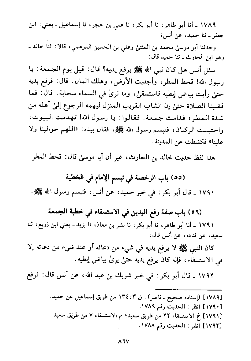1789 - أَنَا أَبُو طَاهِرٍ، نَا أَبُو بَكْرٍ، نَا عَلِيُّ بْنُ حُجْرٍ، نَا إِسْمَاعِيلُ -يَعْنِي ابْنَ جَعْفَرٍ-، ثَنَا حُمَيْدٌ، عَنْ أَنَسٍ؛ وَحَدَّثَنَا أَبُو مُوسَى مُحَمَّدُ بْنُ الْمُثَنَّى وَعَلِيُّ بْنُ الْحُسَيْنِ الدِّرْهَمِيُّ، قَالَا: ثَنَا خَالِدٌ -وَهُوَ ابْنُ الْحَارِثِ- ثَنَا حُمَيْدٌ قَالَ: