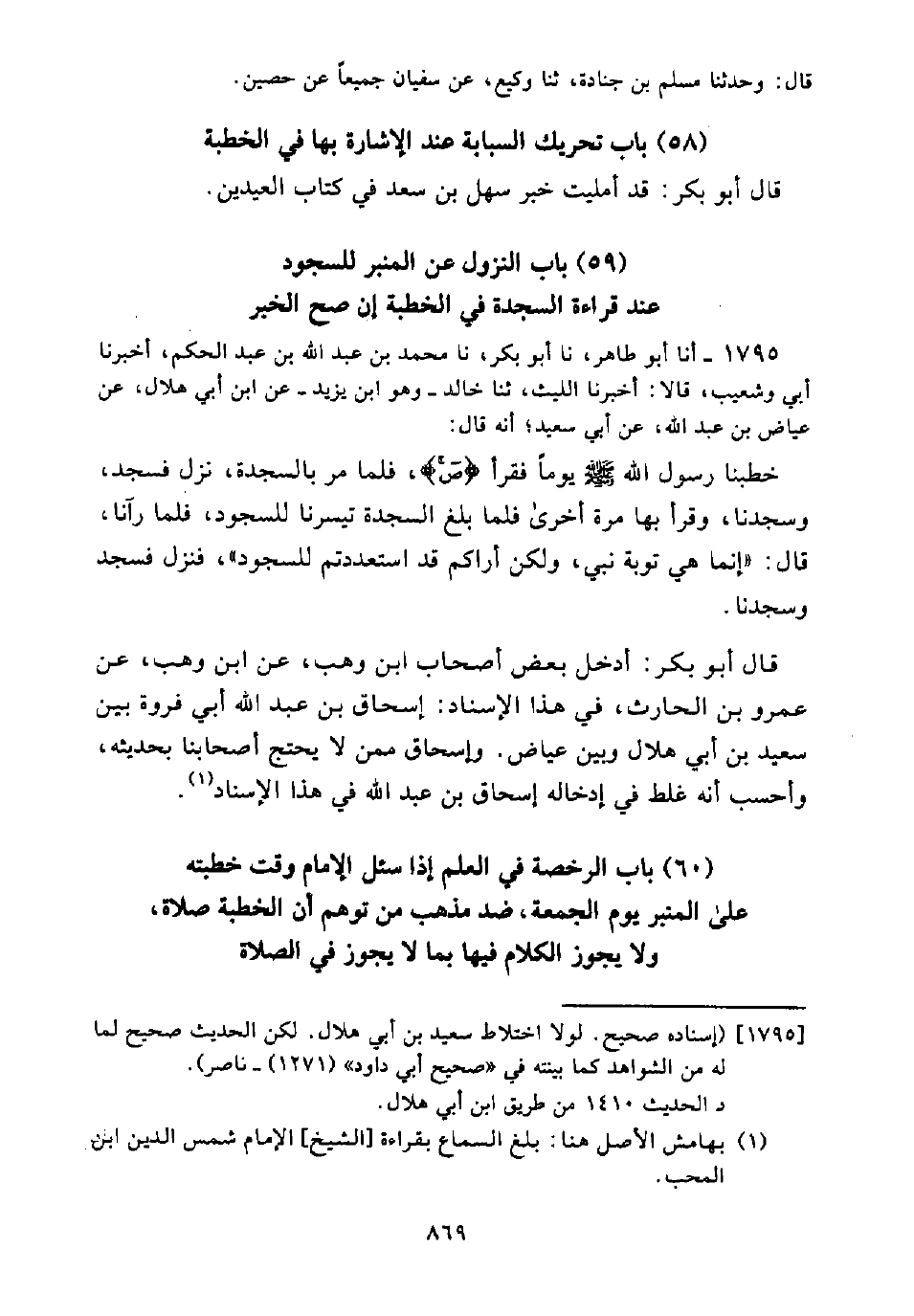 (60) بَابُ الرُّخْصَةِ فِي الْعِلْمِ إِذَا سُئِلَ الْإِمَامُ وَقْتَ خُطْبَتِهِ عَلَى الْمِنْبَرِ يَوْمَ الْجُمُعَةِ، ضِدَّ مَذْهَبِ مَنْ تَوَهَّمَ أَنَّ الْخُطْبَةَ صَلَاةٌ، وَلَا يَجُوزُ الْكَلَامُ فِيهَا بِمَا لَا يَجُوزُ فِي الصَّلَاةِ