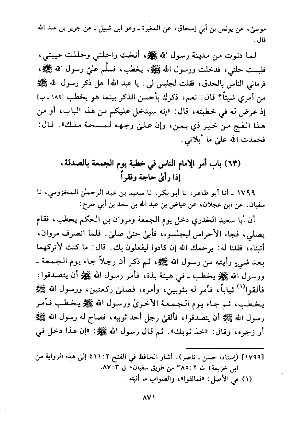 (63) بَابُ أَمْرِ الْإِمَامِ النَّاسَ فِي خُطْبَةِ يَوْمِ الْجُمُعَةِ بِالصَّدَقَةِ، إِذَا رَأَى حَاجَةً، وَفَقْرًا