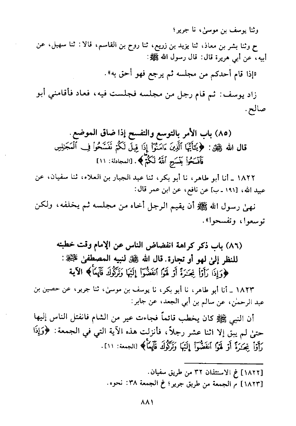 (85) بَابُ الْأَمْرِ بِالتَّوَسُّعِ وَالتَّفَسُّحِ إِذَا ضَاقَ الْمَوْضِعُ. قَالَ اللَّهُ - عَزَّ وَجَلَّ -: (يَا أَيُّهَا الَّذِينَ آمَنُوا إِذَا قِيلَ لَكُمْ تَفَسَّحُوا فِي الْمَجَالِسِ فَافْسَحُوا يَفْسَحِ اللَّهُ لَكُمْ) [المجادله:11]