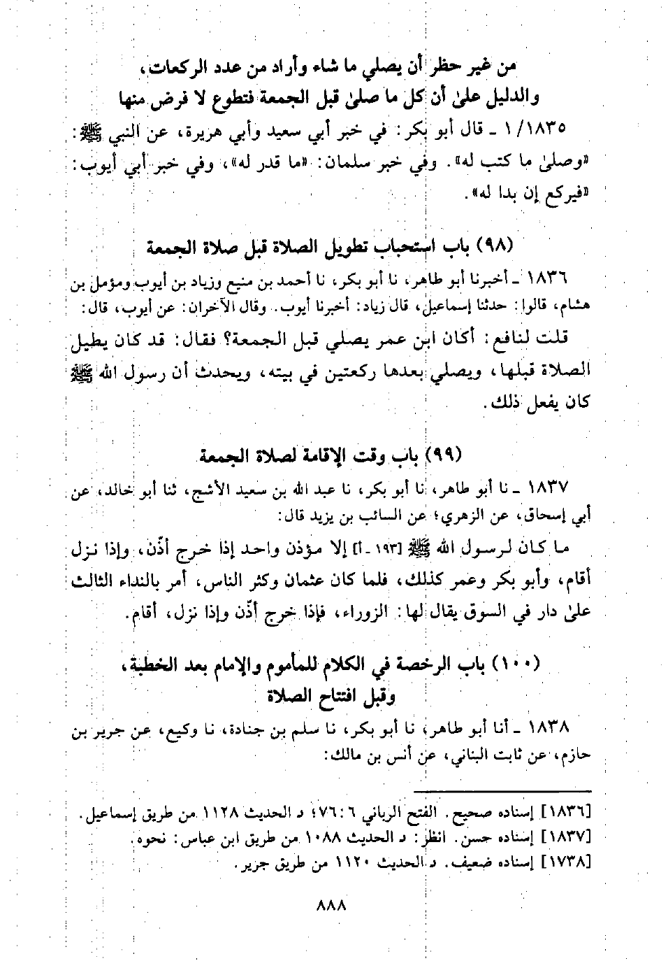 1835/ 1 - قَالَ أَبُو بَكْرٍ: فِي خَبَرِ أَبِي سَعِيدٍ وَأَبِي هُرَيْرَةَ، عَنِ النَّبِيِّ - صَلَّى اللَّهُ عَلَيْهِ وَسَلَّمَ -: "وَصَلَّى مَا كُتِبَ لَهُ". وَفِي خَبَرِ سَلْمَانَ: "مَا قُدِّرَ لَهُ"، وَفِي خَبَرِ أَبِي أَيُّوبَ: "فَيَرْكَعُ إِنْ بَدَا لَهُ".