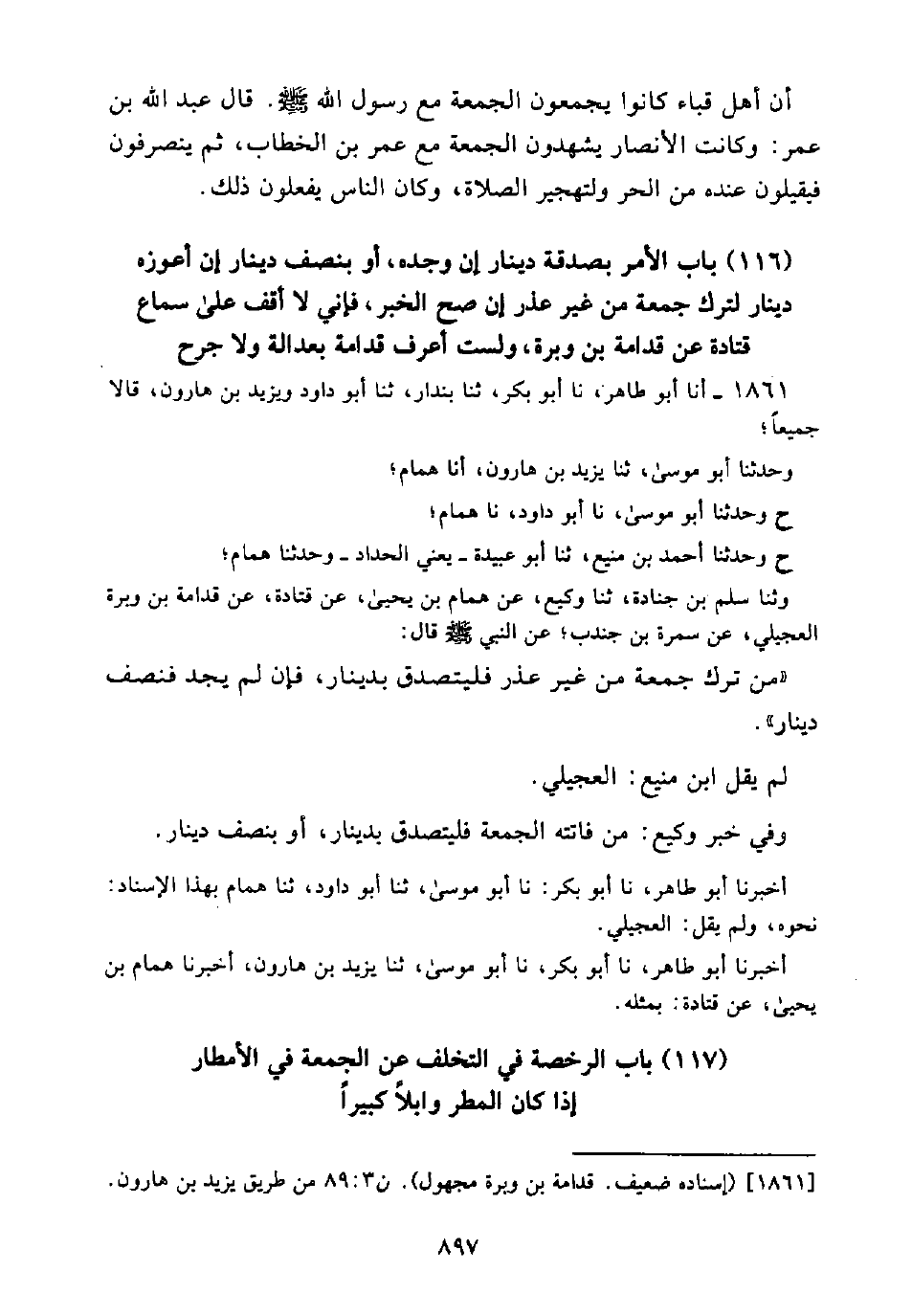(116) بَابُ الْأَمْرِ بِصَدَقَةِ دِينَارٍ إِنْ وَجَدَهُ، أَوْ بِنِصْفِ دِينَارٍ إِنْ أَعْوَزَهُ دِينَارٌ لِتَرْكِ جُمُعَةٍ مِنْ غَيْرِ عُذْرٍ إِنَّ صَحَّ الْخَبَرُ، فَإِنِّي لَا أَقَفُ عَلَى سَمَاعِ قَتَادَةَ عَنْ قُدَامَةَ بْنِ وَبَرَةَ، وَلَسْتُ أَعْرِفُ قُدَامَةَ بِعَدَالَةٍ وَلَا جَرْحٍ