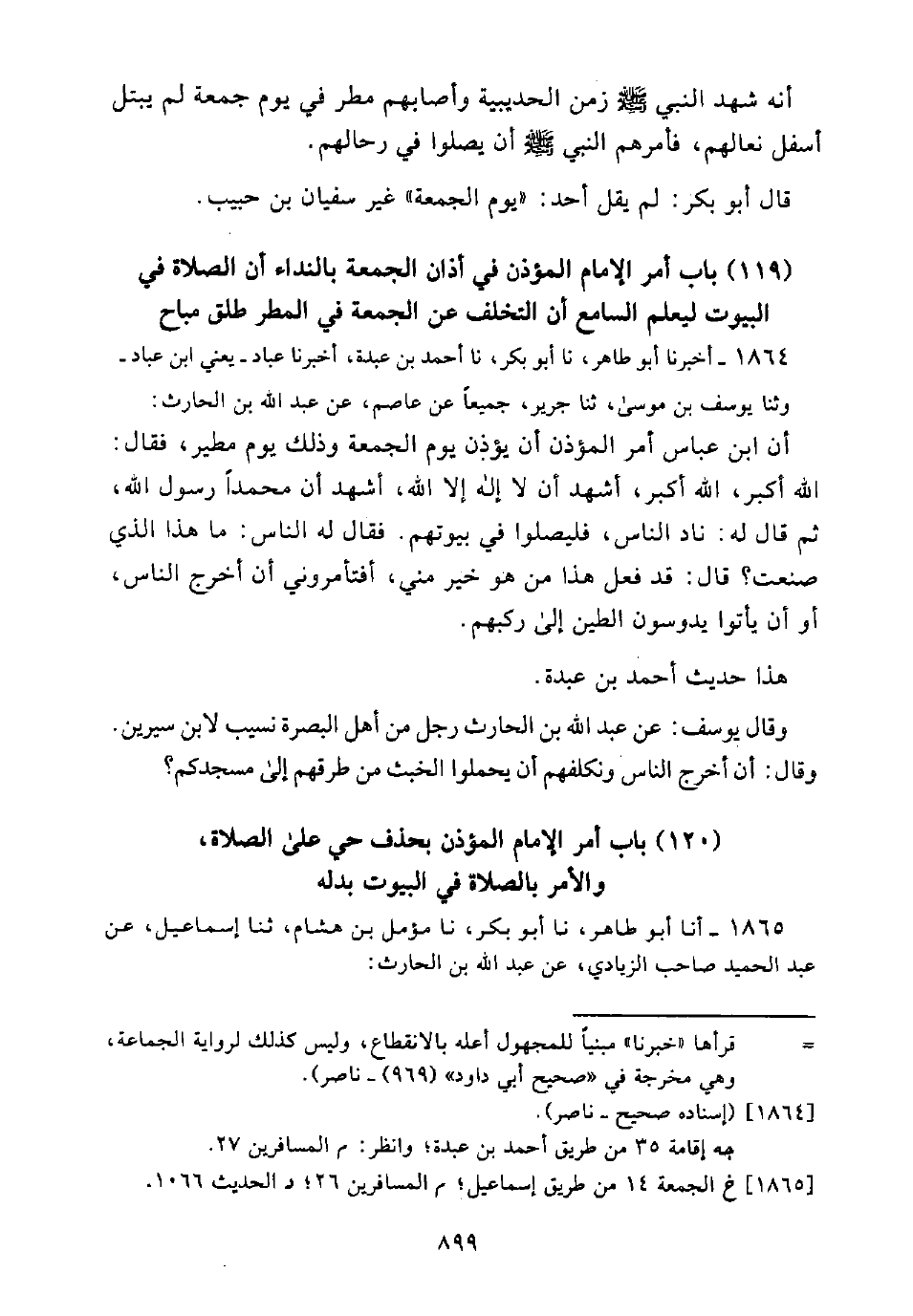 أَنَّ ابْنَ عَبَّاسٍ أَمَرَ الْمُؤَذِّنَ أَنْ يُؤَذِّنَ يَوْمَ الْجُمُعَةِ وَذَلِكَ يَوْمٌ مَطِيرٌ، فَقَالَ: اللَّهُ أَكْبَرُ، اللَّهُ أَكْبَرُ، أَشْهَدُ أَنْ لَا إِلَهَ إِلَّا اللَّهُ، أَشْهَدُ أَنَّ مُحَمَّدًا رَسُولُ اللَّهِ، ثُمَّ قَالَ لَهُ: نَادِ النَّاسَ، فَلْيُصَلُّوا فِي بُيُوتِهِمْ. فَقَالَ لَهُ النَّاسُ: مَا هَذَا الَّذِي صَنَعْتَ؟ قَالَ: قَدْ فَعَلَ هَذَا مَنْ هُوَ خَيْرٌ مِنِّي، أَفَتَأْمُرُونِي أَنْ أُخْرِجَ النَّاسَ، أَوْ أَنْ يَأْتُوا يَدُوسُونَ الطِّينَ إِلَى رُكَبِهِمْ.