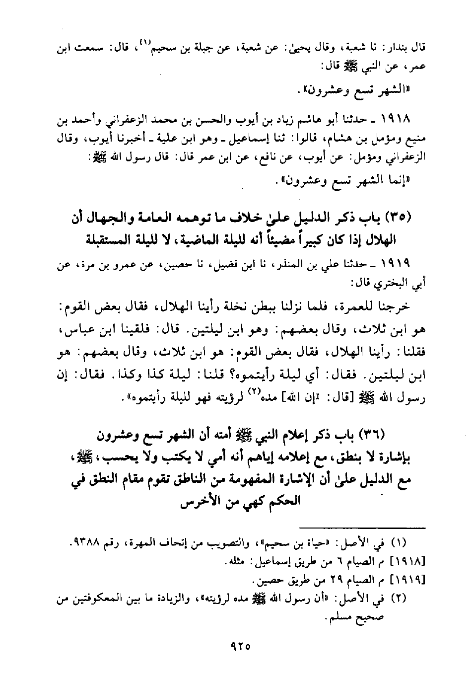 (36) بَاب ذِكْر إِعْلَامِ النَبِيّ - صَلَّى اللَّه عَلَيْهِ وَسَلَّمَ - أُمَّتَهُ أَنَّ الشَّهْرَ تِسْعٌ وَعِشْرُونَ بِإِشَارَةٍ لَا بِنُطْقٍ، مَعَ إِعْلَامِهِ إِيَّاهُمْ أَنَّهُ أُمِّيٌ لَا يَكْتُبُ وَلَا يَحْسِبُ، صَلَّى اللَّه عَلَيْهِ وَسَلَّمَ، مَعَ الدَّلِيلِ عَلَى أَنَّ الْإِشَارَةَ الْمَفْهُومَةَ مِنَ النَّاطِقِ تَقُومُ مَقَامَ النُّطْقِ فِي الْحُكْمِ كَهِيَ مِنَ الْأَخْرَسِ