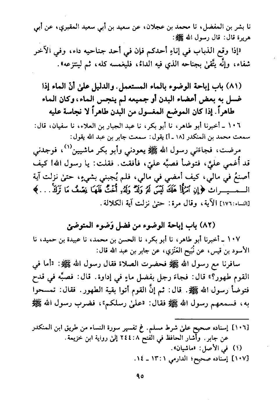 (81) بَابُ إِبَاحَةِ الْوُضُوءِ بِالْمَاءِ الْمُسْتَعْمَلِ. وَالدَّلِيلُ عَلَى أَنَّ الْمَاءَ إِذَا غُسِلَ بِهِ بَعْضُ أَعْضَاءِ الْبَدَنِ أَوْ جَمِيعُهُ لَمْ يَنْجُسِ الْمَاءُ، وَكَانَ الْمَاءُ طَاهِرًا. إِذَا كَانَ الْمَوْضِعُ الْمَغْسُولُ مِنَ الْبَدَنِ طَاهِرًا لَا نَجَاسَةَ عَلَيْهِ