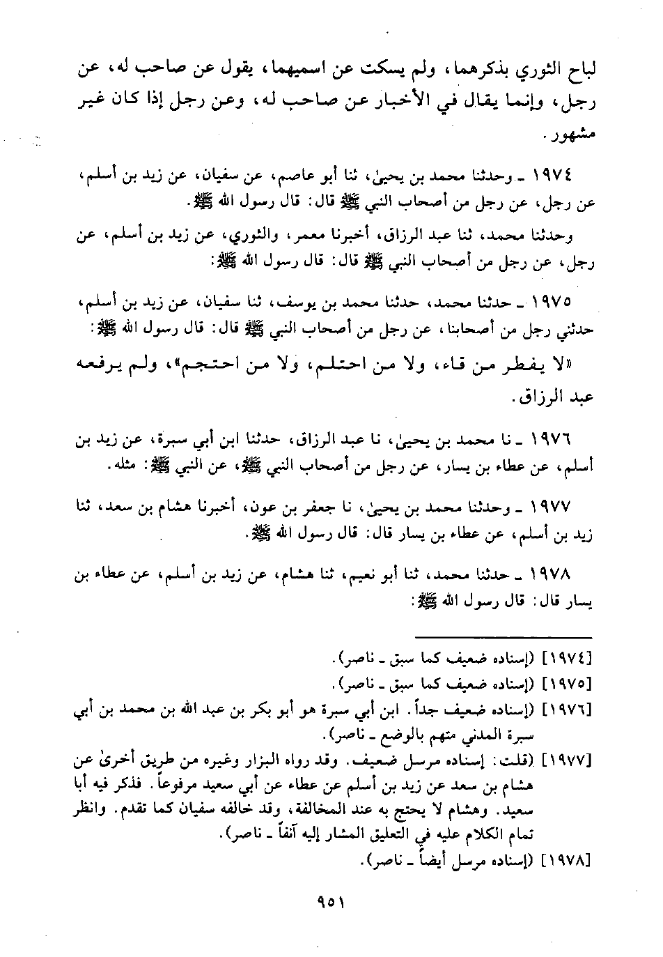1976 - نَا مُحَمَّدُ بْنُ يَحْيَى، نَا عَبْد الرَّزَّاق، حَدَّثَنَا ابْنُ أَبِي سَبْرَةَ، عَنْ زَيْد بْنِ أَسْلَم، عَنْ عَطَاءِ بْنِ يَسَارٍ، عَنْ رَجُل مِنْ أَصْحَاب النَبِيّ - صَلَّى اللَّه عَلَيْهِ وَسَلَّمَ - عَنِ النَبِيّ - صَلَّى اللَّه عَلَيْهِ وَسَلَّمَ -: مِثْلَهُ.