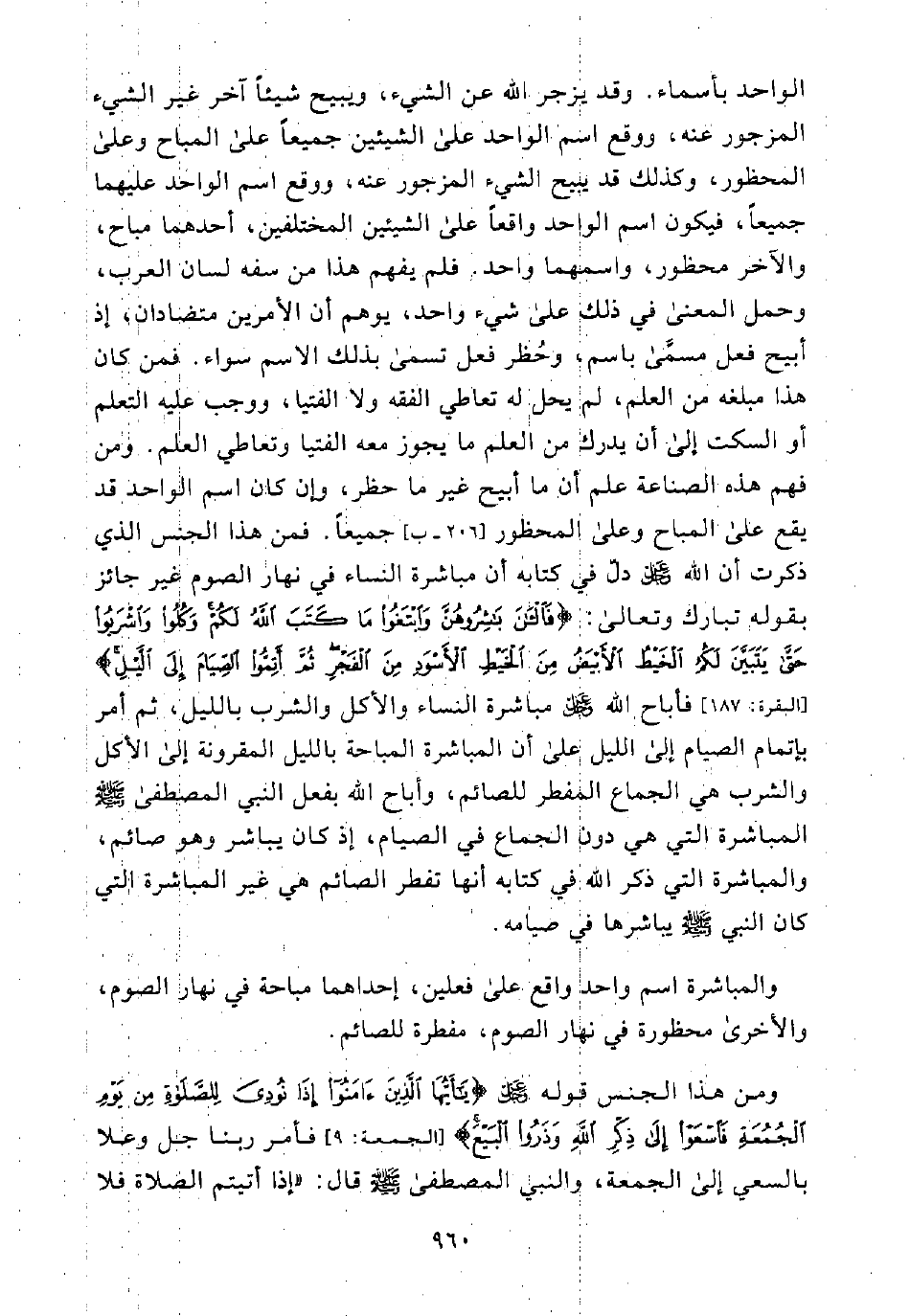 الْوَاحِدُ بِأَسْمَاءَ. وَقَدْ يَزْجُرُ اللَّه عَنِ الشَّيْءِ، وَيُبِيحُ شَيْئًا آخَرَ غَيْر الشَّيْءِ الْمَزْجُورِ عَنْهُ، وَوَقَعَ اسْمُ الْوَاحِدِ عَلَى الشَّيْئَيْنِ جَمِيعًا عَلَى الْمُبَاحِ، وَعَلَى الْمَحْظُورِ، وَكَذَلِكَ قَدْ يُبِيحُ الشَّيْءَ الْمَزْجُورَ عَنْهُ، وَوَقَعَ اسْمُ الْوَاحِدِ عَلَيْهِمَا جَمِيعًا، فَيَكُونُ اسْمُ الْوَاحِدِ وَاقِعًا عَلَى الشَّيْئَيْنِ الْمُخْتَلِفَيْنِ، أَحَدُهُمَا مُبَاحٌ، وَالْآخَرُ مَحْظُورٌ، وَاسْمُهُمَا وَاحِدٌ. فَلَمْ يَفْهَمْ هَذَا مَنْ سَفِهَ لِسَانَ الْعَرَبِ، وَحَمَلَ الْمَعْنَى فِي ذَلِكَ عَلَى شَيْءٍ وَاحِدٍ، يُوهِمُ أَنَّ الْأَمْرَيْنِ مُتَضَادَّانِ، إِذْ أُبِيحَ فِعْلٌ مُسَمًّى بِاسْمٍ، وَحُظِرَ فِعْلٌ تَسَمَّى بِذَلِكَ الِاسْمِ سَوَاءً. فَمَنْ كَانَ هَذَا مَبْلَغُهُ مِنَ الْعِلْمِ، لَمْ يَحِلَّ لَهُ تَعَاطِي الْفِقْهِ وَلَا الْفُتْيَا، وَوَجَبَ عَلَيْهِ التَّعَلُّمُ أَوِ السَّكْتُ إِلَى أَنْ يُدْرِكَ مِنَ الْعِلْمِ مَا يَجُوز مَعَهُ الْفُتْيَا وَتَعَاطِي الْعِلْمِ. وَمَنْ فَهِمَ هَذِهِ الصَّنَاعَةَ عَلِمَ أَنَّ مَا أُبِيحَ غَيْر مَا حُظِرَ، وَإِنْ كَانَ اسْمُ الْوَاحِدِ قَدْ يَقَعُ عَلَى الْمُبَاحِ وَعَلَى الْمَحْظُورِ [206 - ب] جَمِيعًا. فَمِنْ هَذَا الْجِنْسِ الَّذِي ذَكَرْتُ أَنَّ اللَّه - عَزَّ وَجَلَّ - دَلَّ فِي كِتَابِهِ أَنَّ مُبَاشَرَةَ النِّسَاءِ فِي نَهَارِ الصَّوْمِ غَيْر جَائِزٍ بِقَوْلِهِ - تَبَارَكَ وَتَعَالَى -: (فَالْآنَ بَاشِرُوهُنَّ وَابْتَغُوا مَا كَتَبَ اللَّه لَكُمْ وَكُلُوا وَاشْرَبُوا حَتَّى يَتَبَيَّنَ لَكُمُ الْخَيْطُ الْأَبْيَضُ مِنَ الْخَيْطِ الْأَسْوَدِ مِنَ الْفَجْرِ ثُمَّ أَتِمُّوا الصِّيَامَ إِلَى اللَّيْلِ) [البقرة: 187] فَأَبَاحَ اللَّه - عَزَّ وَجَلَّ - مُبَاشَرَةَ النِّسَاءِ وَالْأَكْلَ وَالشُّرْبَ بِاللَّيْلِ، ثُمَّ أَمَرَ بِإِتْمَامِ الصِّيَامِ إِلَى اللَّيْلِ عَلَى أَنَّ الْمُبَاشَرَةَ الْمُبَاحَةَ بِاللَّيْلِ الْمَقْرُونَةَ إِلَى الْأَكْلِ وَالشُّرْبِ هِيَ الْجِمَاعُ الْمُفَطِّرُ لِلصَّائِمِ، وَأَبَاحَ اللَّه بِفِعْلِ النَبِيّ الْمُصْطَفَى - صَلَّى اللَّه عَلَيْهِ وَسَلَّمَ - الْمُبَاشَرَةَ الَّتِي هِيَ دُونَ الْجِمَاعِ فِي الصِّيَامِ، إِذْ كَانَ يُبَاشِرُ وَهُوَ صَائِمٌ، وَالْمُبَاشَرَةُ الَّتِي ذَكَرَ اللَّه فِي كِتَابِهِ أَنَّهَا تُفَطِّرُ الصَّائِمَ هِيَ غَيْر الْمُبَاشَرَةِ الَّتِي كَانَ النَبِيّ - صَلَّى اللَّه عَلَيْهِ وَسَلَّمَ - يُبَاشِرُهَا فِي صِيَامِهِ.