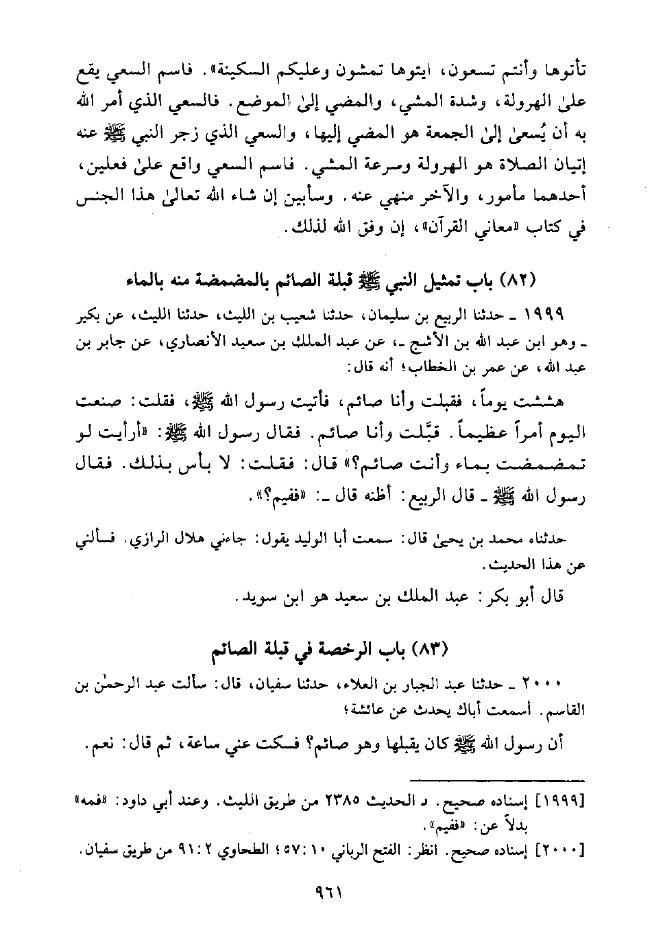 2000 - حَدَّثَنَا عَبْد الْجَبَّارِ بْنُ الْعَلَاءِ، حَدَّثَنَا سُفْيَان قَالَ: سَأَلْتُ عَبْد الرَّحْمَنِ بْنَ الْقَاسِمِ: أَسَمِعْتَ أَبَاكَ يُحَدِّثُ، عَنْ عَائِشَة؛ أَنَّ رَسُولَ اللَّه - صَلَّى اللَّه عَلَيْهِ وَسَلَّمَ - كَانَ يُقَبِّلُهَا وَهُوَ صَائِمٌ؟ فَسَكَتَ عَنِّي سَاعَةً، ثُمَّ قَالَ: نَعَمْ.