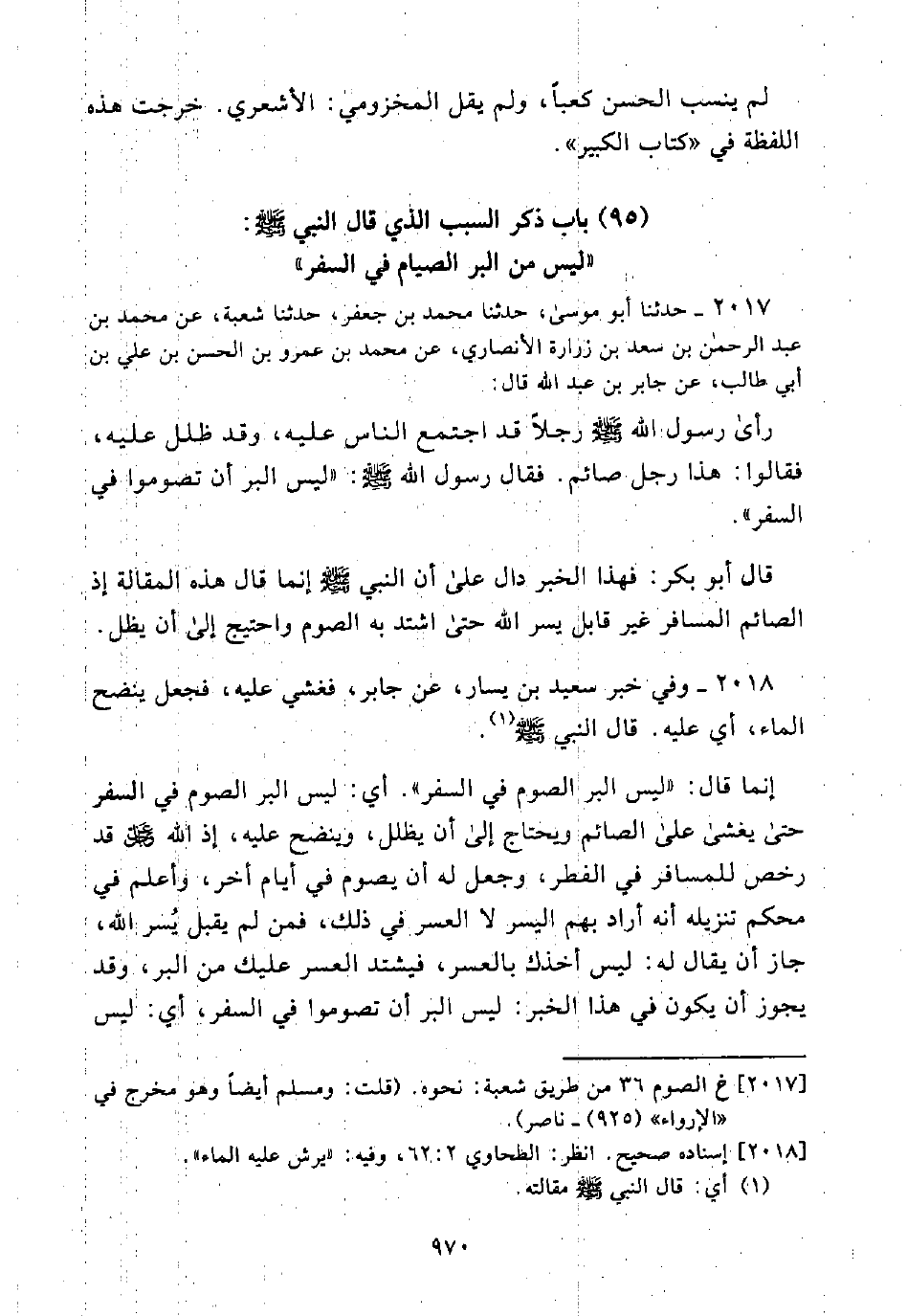 إِنَّمَا قَالَ: "لَيْسَ الْبِرُّ الصَّوْمَ فِي السَّفَرِ": أَيْ: لَيْسَ الْبِرُّ الصَّوْمَ فِي السَّفَرِ حَتَّى يُغْشَى عَلَى الصَّائِمِ وَيُحْتَاجُ إِلَى أَنْ يُظَلَّلَ، وَيُنْضَحَ عَلَيْهِ، إِذِ اللَّه - عَزَّ وَجَلَّ - قَدْ رَخَّصَ لِلْمُسَافِرِ فِي الْفِطْرِ، وَجَعَلَ لَهُ أَنْ يَصُومَ فِي أَيَّامٍ أُخَرَ، وَأَعْلَمَ فِي مُحْكَمِ تَنْزِيلِهِ أَنَّهُ أَرَادَ بِهِمُ الْيُسْرَ لَا الْعُسْرَ فِي ذَلِكَ، فَمَنْ لَمْ يَقْبَلْ يُسْرَ اللَّه، جَازَ أَنْ يُقَالَ لَهُ: لَيْسَ أَخْذُكَ بِالْعُسْرِ، فَيَشْتَدُّ الْعُسْرُ عَلَيْكَ مِنَ الْبِرِّ، وَقَدْ يَجُوز أَنْ يَكُونَ فِي هَذَا الْخَبَر: لَيْسَ الْبِرَّ أَنْ تَصُومُوا فِي السَّفَرِ: أَيْ: لَيْسَ