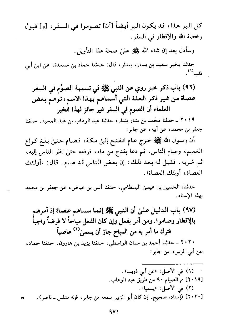 2020 - حَدَّثَنَا أَحْمَد بْنُ سِنَانٍ الْوَاسِطِيُّ، حَدَّثَنَا يَزِيدُ بْنُ هَارُونَ. حَدَّثَنَا حَمَّادٌ، عَنْ أَبِي الزُّبَيْرِ، عَنْ جَابِرٍ: