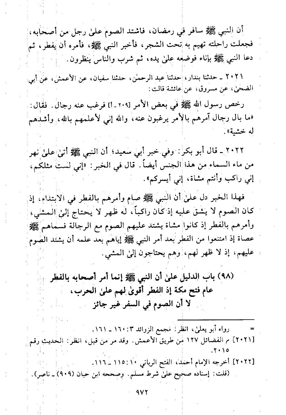 2022 - قَالَ أَبُو بَكْرٍ: وَفِي خَبَر أَبِي سَعِيدٍ أَنَّ النَبِيّ - صَلَّى اللَّه عَلَيْهِ وَسَلَّمَ - أَتَى عَلَى نَهَرٍ مِنْ مَاءِ السَّمَاءِ مِنْ هَذَا الْجِنْسِ أَيْضًا. قَالَ فِي الْخَبَر: "إِنِّي لَسْتُ مِثْلَكُمْ، إِنِّي رَاكِبٌ وَأَنْتُمْ مُشَاةٌ، إِنِّي أَيْسَرُكُمْ".