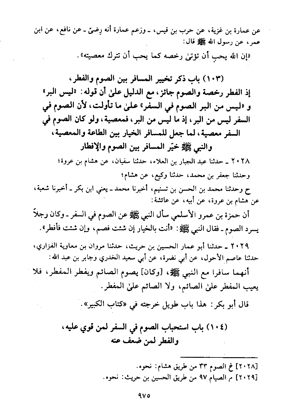 (103) بَاب ذِكْر تَخْيِيرِ الْمُسَافِرِ بَيْنَ الصَّوْمِ وَالْفِطْرِ، إِذِ الْفِطْرُ رُخْصَةٌ وَالصَّوْمُ جَائِزٌ، مَعَ الدَّلِيلِ عَلَى أَنَّ قَوْلَهُ: "لَيْسَ الْبِرُّ" وَ"لَيْسَ مِنَ الْبِرِّ الصَّوْمُ فِي السَّفَرِ" عَلَى مَا تَأَوَّلْتُ، لِأَنَّ الصَّوْمَ فِي السَّفَرِ لَيْسَ مِنَ الْبِرِّ، إِذْ مَا لَيْسَ مِنَ الْبِرِّ، فَمَعْصِيَةٌ، وَلَوْ كَانَ الصَّوْمُ فِي السَّفَرِ مَعْصِيَةً، لَمَا جَعَلَ لِلْمُسَافِرِ الْخِيَارَ بَيْنَ الطَّاعَةِ وَالْمَعْصِيَةِ، وَالنَبِيّ - صَلَّى اللَّه عَلَيْهِ وَسَلَّمَ - خَيَّرَ الْمُسَافِرَ بَيْنَ الصَّوْمِ وَالْإِفْطَارِ