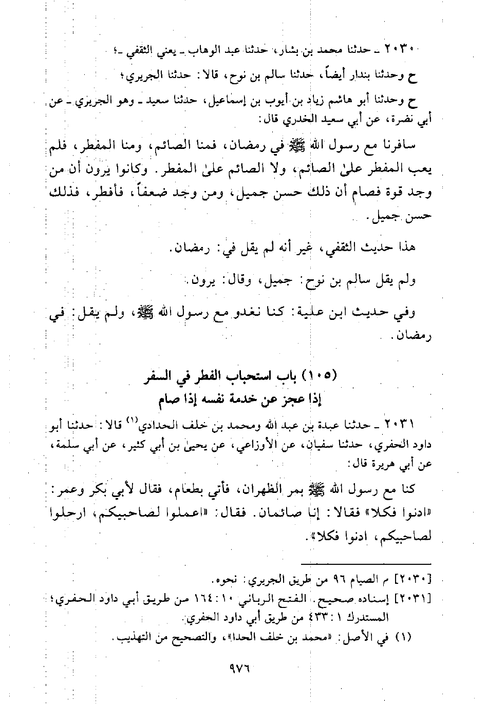 2031 - حَدَّثَنَا عَبْدةُ بْنُ عَبْد اللَّه وَمُحَمَّدُ بْنُ خَلَفٍ الْحَدَّادِيُّ (¬1) قَالَا: حَدَّثَنَا أَبُو دَاوُدَ الْحَفَرِيُّ، حَدَّثَنَا سُفْيَان، عَنِ الْأَوْزَاعِيِّ، عَنْ يَحْيَى بْنِ أَبِي كَثِيرٍ، عَنْ أَبِي سَلَمَةَ، عَنْ أَبِي هُرَيْرَة قَالَ: