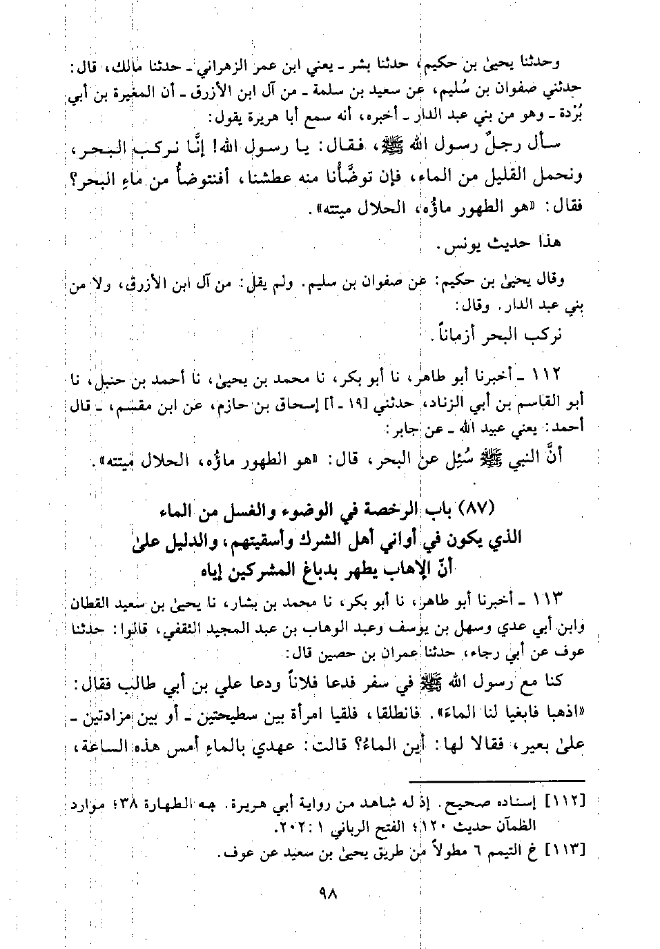 سَأَلَ رَجُلٌ رَسُولَ اللَّهِ - صَلَّى اللَّهُ عَلَيْهِ وَسَلَّمَ - فَقَالَ: يَا رَسُولَ اللَّهِ! إِنَّا نَرْكَبُ الْبَحْرَ، وَنَحْمِلُ الْقَلِيلَ مِنَ الْمَاءِ، فَإِنْ تَوَضَّأْنَا مِنْهُ عَطِشْنَا، أَفَنَتَوَضَّأُ مِنْ مَاءِ الْبَحْرِ؟ فَقَالَ: "هُوَ الطَّهُورُ مَاؤُهُ، الْحَلَالُ مَيْتَتُهُ".