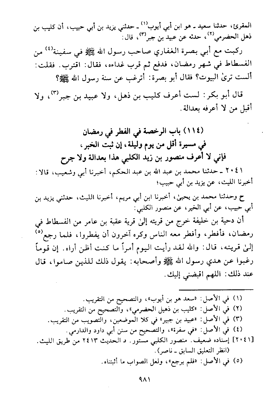 (114) بَاب الرُّخْصَةِ فِي الْفِطْرِ فِي رَمَضَانَ فِي مَسِيرَةِ أَقَلِّ مِنْ يَوْمٍ وَلَيْلَةٍ، إِنْ ثَبَتَ الْخَبَر، فَإِنِّي لَا أَعْرِفُ مَنْصُورَ بْنَ زَيْد الْكَلْبِيِّ هَذَا بِعَدَالَةٍ وَلَا جَرْحٍ