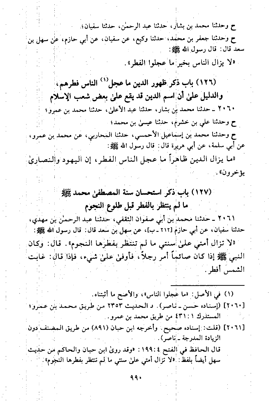"مَا يَزَالُ الدِّينُ ظَاهِرًا مَا عَجَّلَ النَّاسُ الْفِطْرَ، إِنَّ الْيَهُودَ وَالنَّصَارَى يُؤَخِّرُونَ".