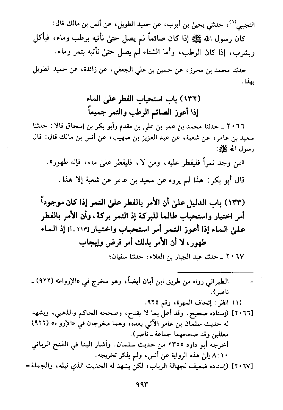 (133) بَاب الدَّلِيلِ عَلَى أَنَّ الْأَمْرَ بِالْفِطْرِ عَلَى التَّمْرِ إِذَا كَانَ مَوْجُودًا أَمْرُ اخْتِيَارٍ وَاسْتِحْبَاب طَالَمَا لِلْبَرَكَةِ إِذِ التَّمْرُ بَرَكَةٌ، وَأَنَّ الْأَمْرَ بِالْفِطْرِ عَلَى الْمَاءِ إِذَا أَعْوَزَ التَّمْرُ أَمْرَ اسْتِحْبَاب وَاخْتِيَارٍ [213 - أ] إِذِ الْمَاءُ طَهُورٌ، لَا أَنَّ الْأَمْرَ بِذَلِكَ أَمْرَ فَرْضٍ وَإِيجَابٍ