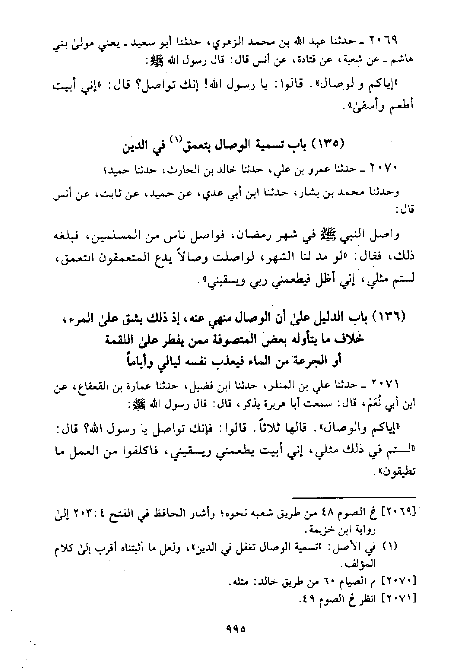 "إِيَّاكُمْ وَالْوِصَالَ". قَالَهَا ثَلَاثًا. قَالُوا: فَإِنَّكَ تُوَاصِلُ يَا رَسُولَ اللَّه؟ قَالَ: "لَسْتُمْ فِي ذَلِكَ مِثْلِي، إِنِّي أَبِيتُ يُطْعِمُنِي وَيَسْقِينِي، فَاكْلَفُوا مِنَ الْعَمَلِ مَا تُطِيقُونَ".