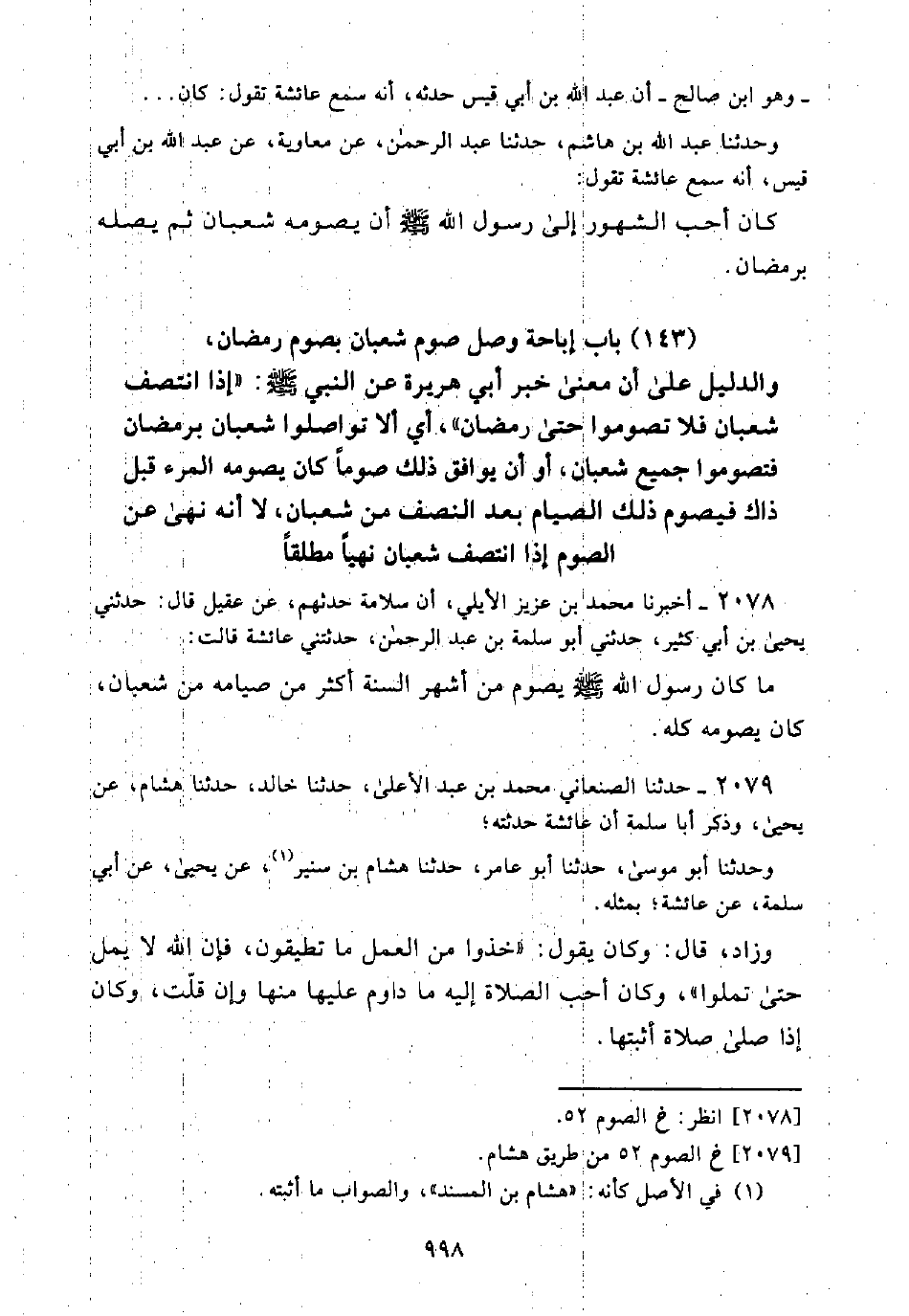 (143) بَاب إِبَاحَةِ وَصْلِ صَوْمِ شَعْبَانَ بِصَوْمِ رَمَضَانَ، وَالدَّلِيلِ عَلَى أَنَّ مَعْنَى خَبَر أَبِي هُرَيْرَة عَنِ النَبِيّ - صَلَّى اللَّه عَلَيْهِ وَسَلَّمَ -: "إِذَا انْتَصَفَ شَعْبَانُ فَلَا تَصُومُوا حَتَّى رَمَضَانَ"، أَيْ أَلَا تُوَاصِلُوا شَعْبَانَ بِرَمَضَانَ فَتَصُومُوا جَمِيعَ شَعْبَانَ، أَوْ أَنْ يُوَافِقَ ذَلِكَ صَوْمًا كَانَ يَصُومُهُ الْمَرْءُ قَبْلَ ذَاكَ فَيَصُومُ ذَلِكَ الصِّيَامَ بَعْدَ النِّصْفِ مِنْ شَعْبَانَ، لَا أَنَّهُ نَهَى عَنِ الصَّوْمِ إِذَا انْتَصَفَ شَعْبَانُ نَهْيًا مُطْلَقًا