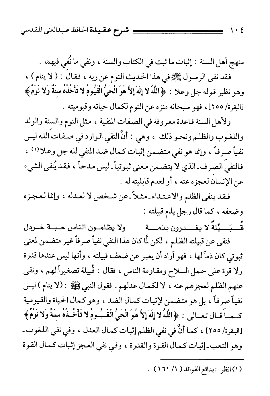فنفى عن قبيلته الظلم، لكن لمَّا كان هذا النفي نفياً صرفاً غير متضمن لمعنى ثبوتي كان ذماً لها، فهو أراد أن يعبر عن ضعف قبيلته، وأنها ليس عندها قدرة ولا قوة على حمل السلاح ومقاومة الناس، فقال: قُبيلة تصغيراً لهم، ونفى عنهم الظلم لعجزهم عنه، لا لكمال عدلهم. فقول النبي صلى الله عليه وسلم: " لا ينام " ليس نفياً صِرفاً، بل هو متضمن لإثبات كمال الضد، وهو كمال الحياة والقيومية كما قال تعالى: {اللَّهُ لا إِلَهَ إِلاَّ هُوَ الْحَيُّ الْقَيُّومُ لا تَأْخُذُهُ سِنَةٌ وَلا نَوْمٌ} ، كما أنَّ في نفي الظلم إثبات كمال العدل، وفي نفي اللغوب ـ وهو التعب ـ إثبات كمال القوة والقدرة، وفي نفي العجز إثبات كمال القوة
