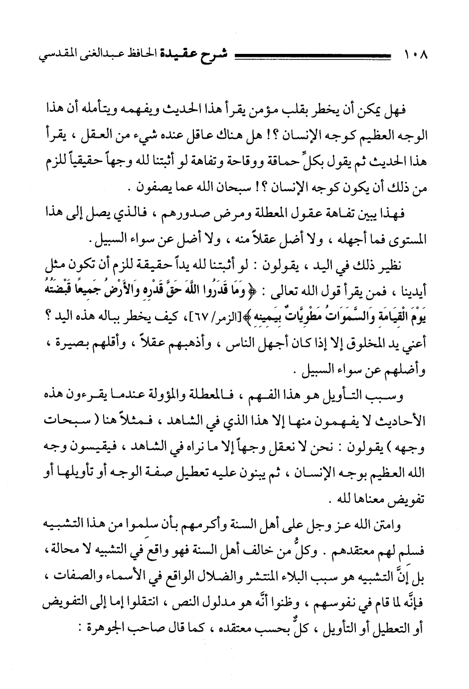 نظير ذلك في اليد، يقولون: لو أثبتنا لله يداً حقيقة للزم أن تكون مثل أيدينا، فمن يقرأ قول الله تعالى: {وَمَا قَدَرُوا اللَّهَ حَقَّ قَدْرِهِ وَالأَرْضُ جَمِيعاً قَبْضَتُهُ يَوْمَ الْقِيَامَةِ وَالسَّمَاوَاتُ مَطْوِيَّاتٌ بِيَمِينِهِ} 1، كيف يخطر بباله هذه اليد؟ أعني يد المخلوق إلا إذا كان أجهل الناس، وأذهبهم عقلاً، وأقلهم بصيرة، وأضلهم عن سواء السبيل.