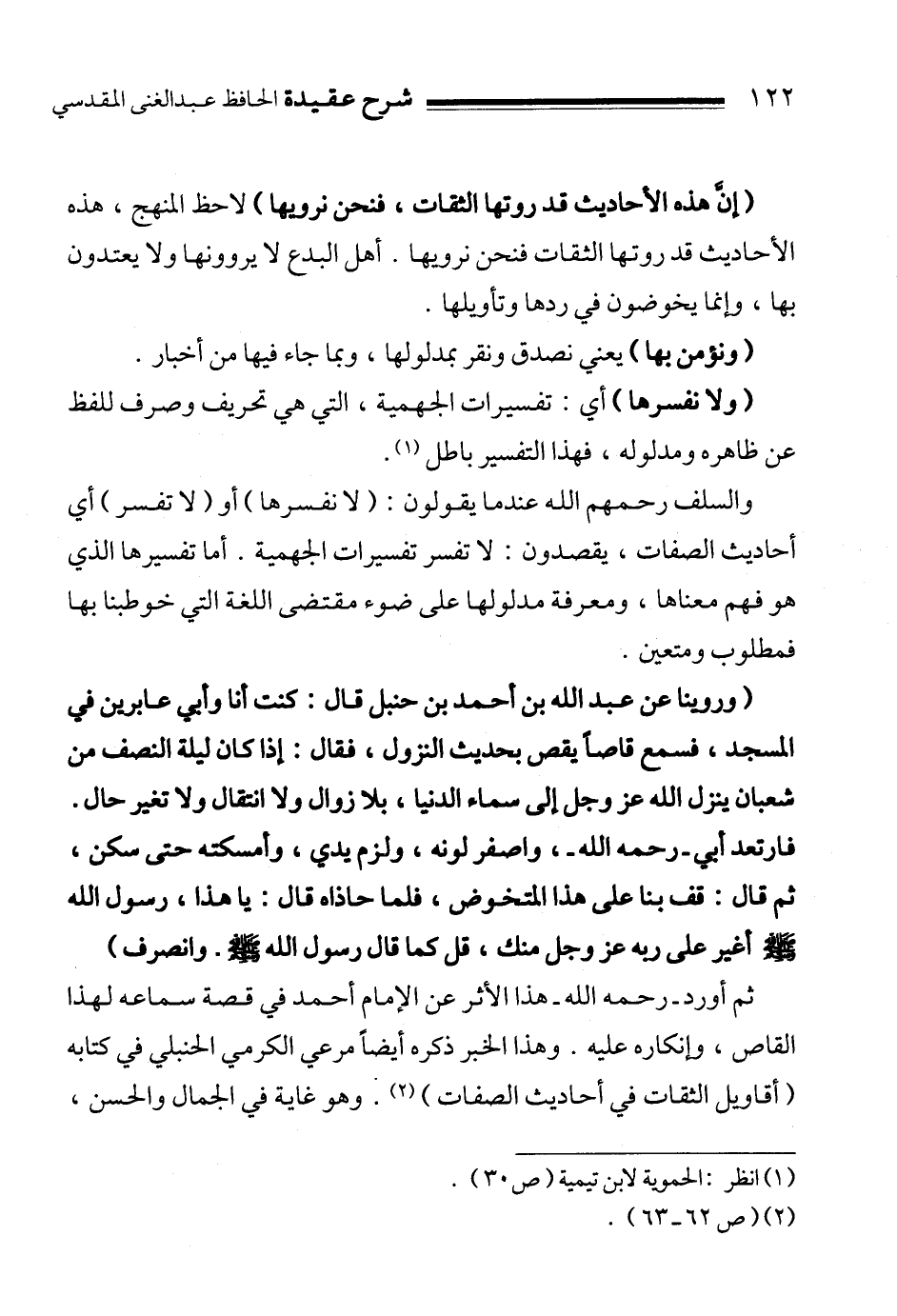 " وروينا عن عبد الله بن أحمد بن حنبل قال: كنت أنا وأبي عابرين في المسجد، فسمع قاصاً يقص بحديث النزول، فقال: إذا كان ليلة النصف من شعبان ينزل الله عز وجل إلى سماء الدنيا، بلا زوال ولا انتقال ولا تغير حال. فارتعد أبي ـ رحمه الله ـ، واصفر لونه، ولزم يدي، وأمسكته حتى سكن، ثم قال: قف بنا على هذا المتخوض، فلما حاذاه قال: يا هذا، رسول الله صلى الله عليه وسلم أغير على ربه عز وجل منك، قل كما قال رسول الله صلى الله عليه وسلم. وانصرف "