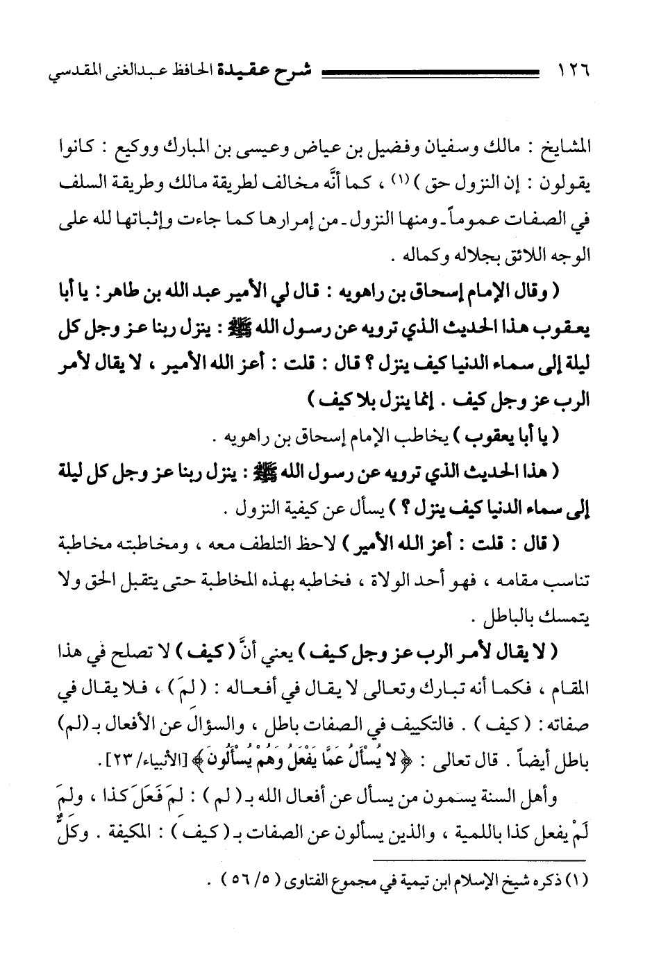 " وقال الإمام إسحاق بن راهويه: قال لي الأمير عبد الله بن طاهر: يا أبا يعقوب هذا الحديث الذي ترويه عن رسول الله صلى الله عليه وسلم: ينزل ربنا عز وجل كل ليلة إلى سماء الدنيا كيف ينزل؟ قال: قلت: أعز الله الأمير، لا يقال لأمر الرب عز وجل كيف. إنما ينزل بلا كيف "
