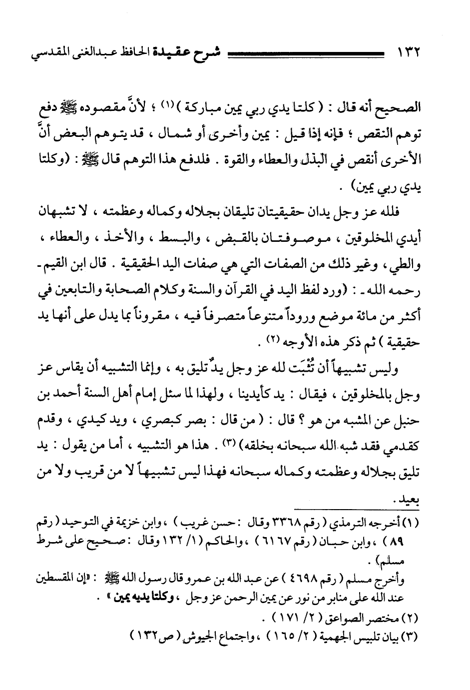 وليس تشبيهاً أن يثبت لله عز وجل يدٌ تليق به، وإنما التشبيه أن يقاس عز وجل بالمخلوقين، فيقال: يد كأيدينا، ولهذا لما سئل إمام أهل السنة أحمد ابن حنبل عن المشبه من هو؟ قال:"من قال: بصر كبصري، ويد كيدي، وقدم كقدمي فقد شبه الله سبحانه بخلقه"3. هذا هو التشبيه، أما من يقول: يد تليق بجلاله وعظمته وكماله سبحانه فهذا ليس تشبيهاً لا من قريب ولا من بعيد.