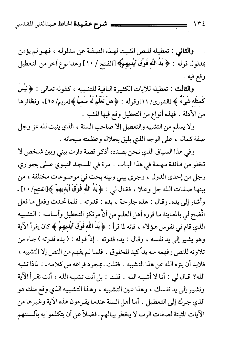 وفي هذا السياق الذي نحن بصدده أذكر قصة دارت بيني وبين شخص لا تخلو من فائدة مهمة في هذا الباب. مرة في المسجد النبوي صلى بجواري رجل من إحدى الدول، وجرى بيني وبينه بحث في موضوعات مختلفة، من بينها صفات الله جل وعلا، فقال لي: {يَدُ اللَّهِ فَوْقَ أَيْدِيهِمْ} 3 ـ وأشار إلى يده ـ وقال: هذه جارحة، يده: قدرته. فلما تحدث وفعل ما فعل اتَّضح لي بالمعاينة ما قرره أهل العلم من أنَّ مرتكز التعطيل وأساسه: التشبيه الذي قام في نفوس هؤلاء، فإنه لما قرأ: {يَدُ اللَّهِ فَوْقَ أَيْدِيهِمْ} كان يقرأ الآية وهو يشير إلى يد نفسه، وقال: يده قدرته. إذاً قوله: " يده قدرته " جاء من تلاوته للنص وفهمه منه يداً كيد المخلوق. فلما لم يفهم من النص إلا التشبيه، فلابد أن ينزه الله عن هذا التشبيه. فقلت ـ بمجرد فراغه من كلامه ـ: لماذا تشبه الله؟ قال لي: أنا لا أشبه الله. قلت: بل أنت تشبه الله، أنت تقرأ الآية وتشير إلى يد نفسك، وهذا عين التشبيه، وهذا التشبيه الذي وقع منك هو الذي جرك إلى التعطيل. أما أهل السنة عندما يقرءون هذه الآية وغيرها من الآيات المثبتة لصفات الرب لا يخطر ببالهم ـ فضلاً عن أن يتكلموا به بألسنتهم