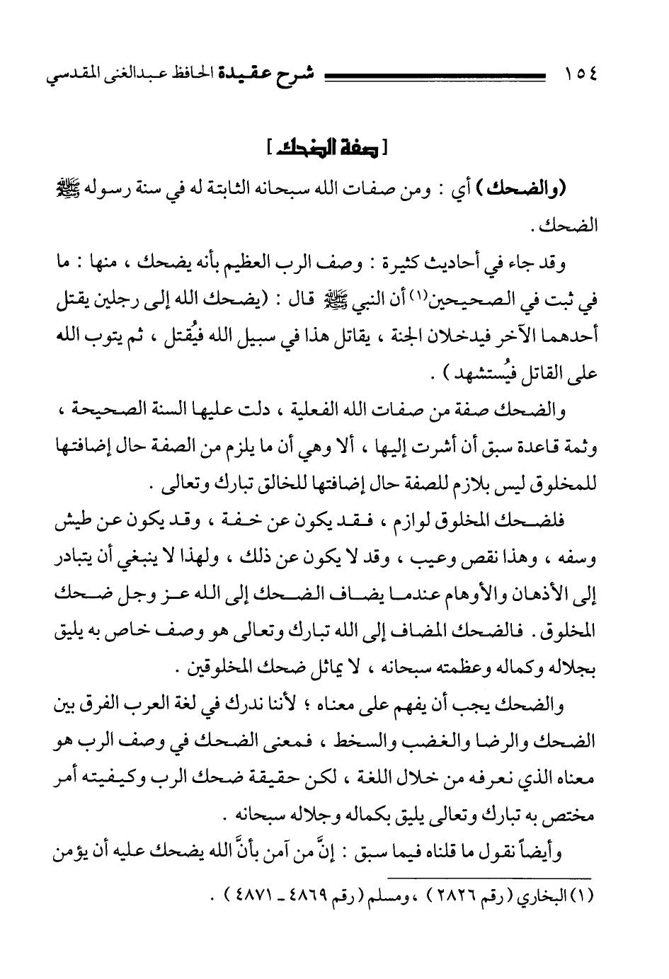 وقد جاء في أحاديث كثيرة: وصف الرب العظيم بأنه يضحك، منها: ما في ثبت في الصحيحين 1 أن النبي صلى الله عليه وسلم قال:"يضحك الله إلى رجلين يقتل أحدهما الآخر فيدخلان الجنة، يقاتل هذا في سبيل الله فيُقتل، ثم يتوب الله على القاتل فيُستشهد".