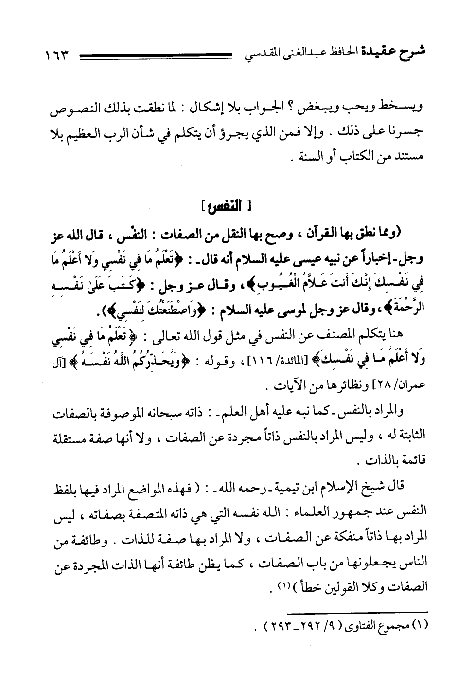 قال شيخ الإسلام ابن تيمية ـ رحمه الله ـ:" فهذه المواضع المراد فيها بلفظ النفس عند جمهور العلماء: الله نفسه التي هي ذاته المتصفة بصفاته، ليس المراد بها ذاتاً منفكة عن الصفات، ولا المراد بها صفة للذات. وطائفة من الناس يجعلونها من باب الصفات، كما يظن طائفة أنها الذات المجردة عن الصفات وكلا القولين خطأ"3.