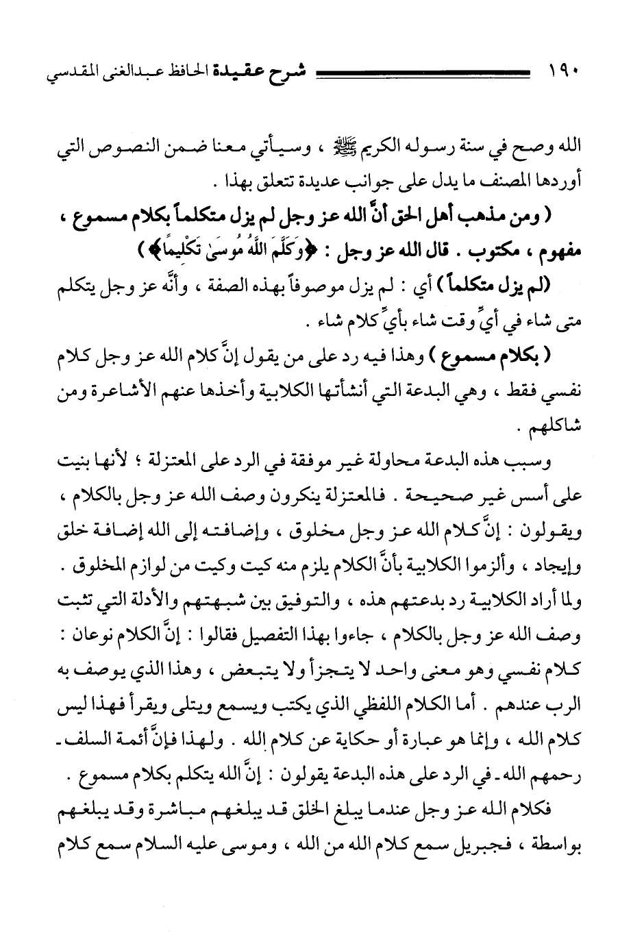 " ومن مذهب أهل الحق أنَّ الله عز وجل لم يزل متكلماً بكلام مسموع، مفهوم، مكتوب. قال الله عز وجل {وَكَلَّمَ اللَّهُ مُوسَى تَكْلِيماً} "