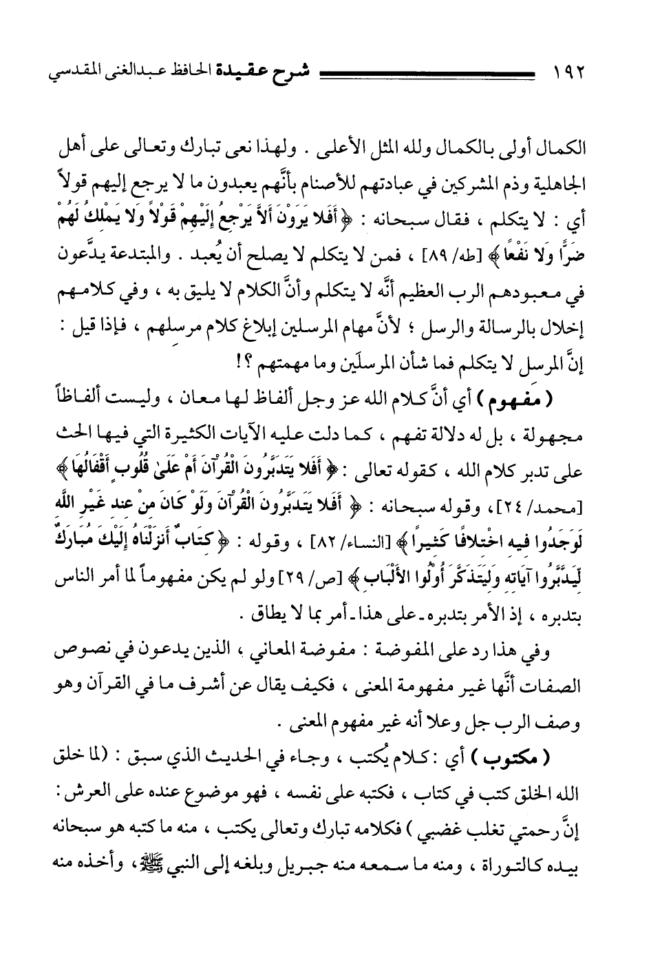 " مفهوم " أي أنَّ كلام الله عز وجل ألفاظ لها معان، وليست ألفاظاً مجهولة، بل له دلالة تفهم، كما دلت عليه الآيات الكثيرة التي فيها الحث على تدبر كلام الله، كقوله تعالى: {أَفَلا يَتَدَبَّرُونَ الْقُرْآنَ أَمْ عَلَى قُلُوبٍ أَقْفَالُهَا} 2، وقوله سبحانه: {أَفَلا يَتَدَبَّرُونَ الْقُرْآنَ وَلَوْ كَانَ مِنْ عِنْدِ غَيْرِ اللَّهِ لَوَجَدُوا فِيهِ اخْتِلافاً كَثِيراً} 3، وقوله: {كِتَابٌ أَنْزَلْنَاهُ إِلَيْكَ مُبَارَكٌ لِيَدَّبَّرُوا آيَاتِهِ وَلِيَتَذَكَّرَ أُولُو الأَلْبَابِ} 4. ولو لم يكن مفهوماً لما أمر الناس بتدبره، إذ الأمر بتدبره ـ على هذا ـ أمر بما لا يطاق.