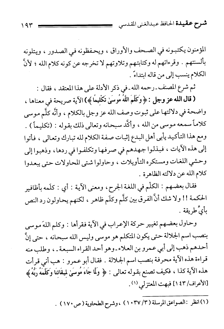" قال الله عز وجل: {وَكَلَّمَ اللَّهُ مُوسَى تَكْلِيماً} " الآية صريحة في معناها، واضحة في دلالتها على ثبوت وصف الله عز وجل بالكلام، وأنَّه كلَّم موسى كلاماً سمعه موسى من الله، وأكَّد سبحانه وتعالى ذلك بقوله: " تكليماً ". ومع هذا التأكيد يأبى أهل البدع إثبات صفة الكلام لله تبارك وتعالى، فأتوا إلى هذه الآيات، فبذلوا جهدهم في صرفها وتكلفوا في ردها، وذهبوا إلى وحشي اللغات ومستكره التأويلات، وحاولوا شتى المحاولات حتى يبعدوا كلام الله عن دلالته الظاهرة.