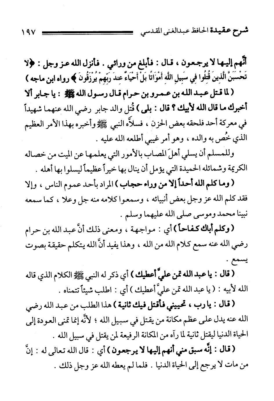" وكلم أباك كفاحاً " أي: مواجهة، ومعنى ذلك أنَّ عبد الله بن حرام سمع كلام الله من الله، وهذا يفيد أنَّ الله يتكلم حقيقة بصوت يسمع.